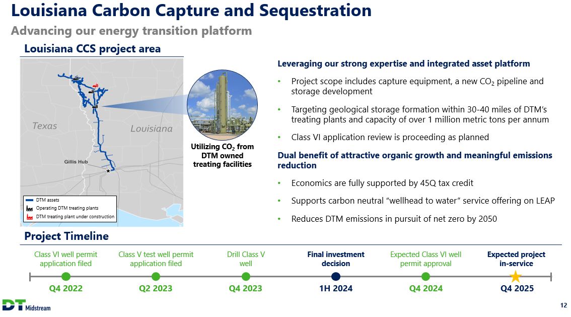 12 Louisiana Carbon Capture and Sequestration Leveraging our strong expertise and integrated asset platform • Project scope includes capture equipment, a new CO 2 pipeline and storage development • Targeting geological storage formation within 30 - 40 miles of DTM’s treating plants and capacity of over 1 million metric tons per annum • Class VI application review is proceeding as planned Dual benefit of attractive organic growth and meaningful emissions reduction • Economics are fully supported by 45Q tax credit • Supports carbon neutral “wellhead to water” service offering on LEAP • Reduces DTM emissions in pursuit of net zero by 2050 DTM assets Operating DTM treating plants DTM treating plant under construction Louisiana CCS project area Utilizing CO 2 from DTM owned treating facilities Advancing our energy transition platform Project Timeline Q4 2022 Class VI well permit application filed Q4 2023 Drill Class V well Q2 2023 Class V test well permit application filed Q4 2024 Expected Class VI well permit approval Q4 2025 Expected project in - service 1H 2024 Final investment decision