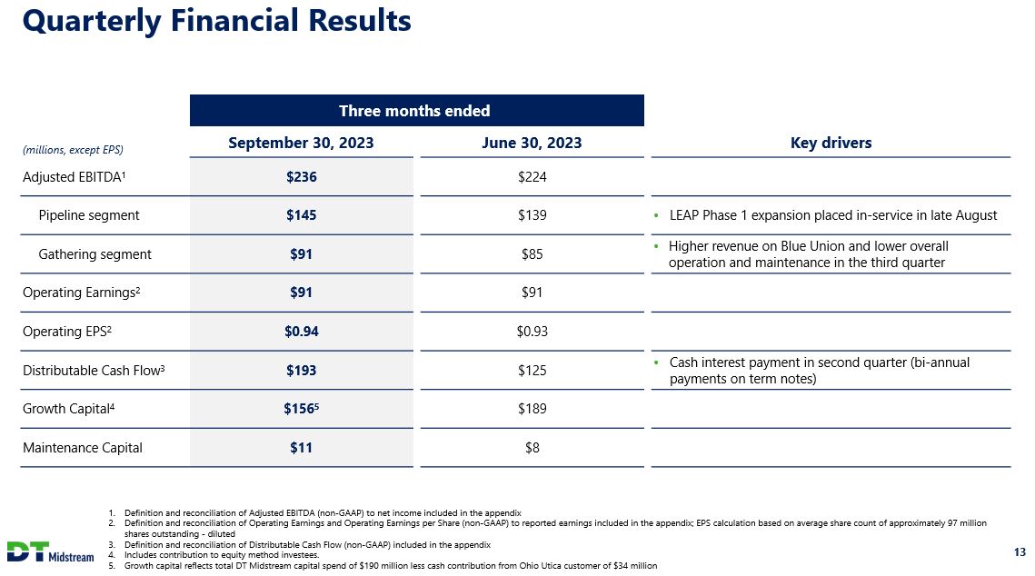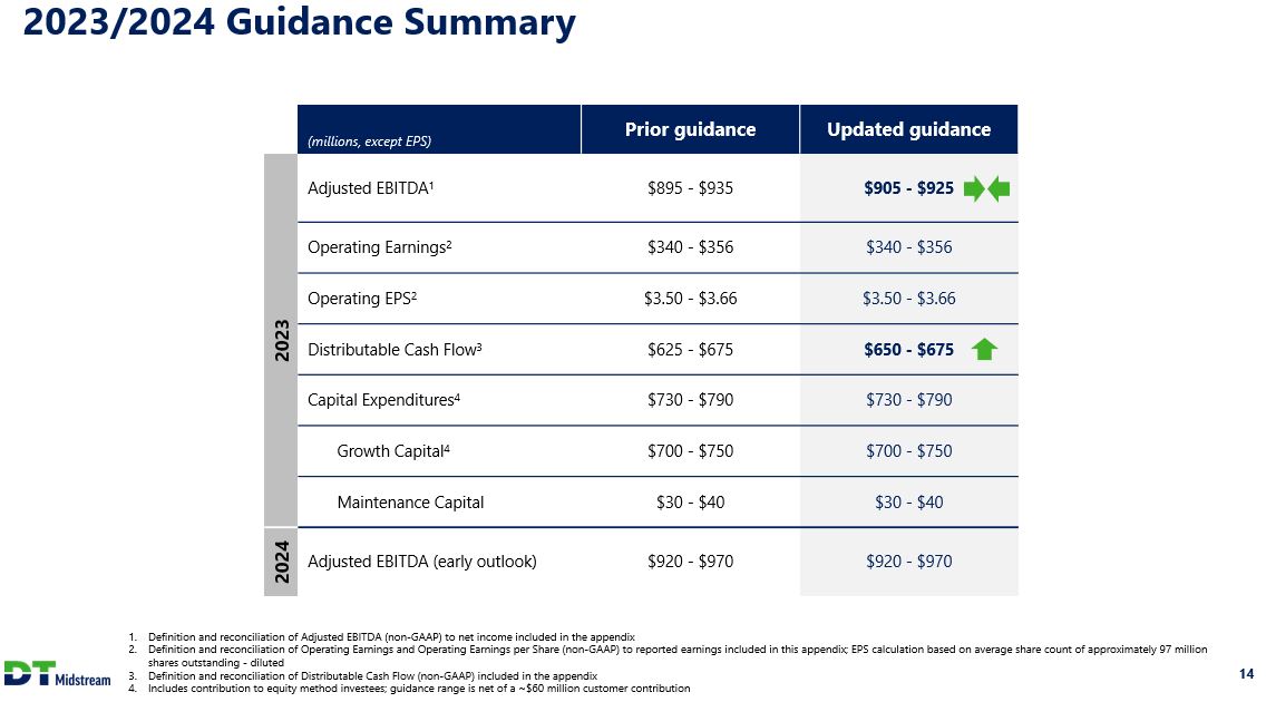 1. Definition and reconciliation of Adjusted EBITDA (non - GAAP) to net income included in the appendix 2. Definition and reconciliation of Operating Earnings and Operating Earnings per Share (non - GAAP) to reported earnings included in the appendix; EPS calculation based on average share count of approximately 97 million shares outstanding - diluted 3. Definition and reconciliation of Distributable Cash Flow (non - GAAP) included in the appendix 4. Includes contribution to equity method investees. 5. Growth capital reflects total DT Midstream capital spend of $190 million less cash contribution from Ohio Utica customer of $ 34 million 13 Quarterly Financial Results Three months ended (millions , except EPS ) September 30, 202 3 June 30, 202 3 Key drivers Adjusted EBITDA 1 $236 $224 Pipeline segment $145 $139 • LEAP Phase 1 expansion placed in - service in late August Gathering segment $91 $85 • Higher revenue on Blue Union and lower overall operation and maintenance in the third quarter Operating Earnings 2 $91 $91 Operating EPS 2 $0.94 $0.93 Distributable Cash Flow 3 $193 $125 • Cash interest payment in second quarter (bi - annual payments on term notes) Growth Capital 4 $156 5 $189 Maintenance Capital $11 $8