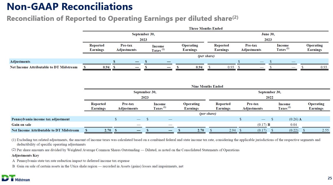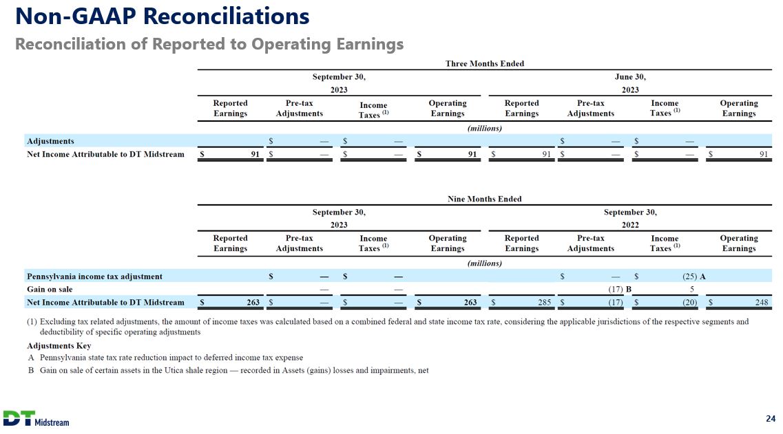 Non - GAAP Reconciliations Reconciliation of Reported to Operating Earnings New slide 24 DT MIDSTREAM, INC. RECONCILIATION OF REPORTED TO OPERATING EARNINGS (NON-GAAP) -------------------------------------------------------------------------------- THREE MONTHS ENDED -------------------------------------------------------------------------------------- SEPTEMBER 30, JUNE 30, 2023 2023 -------------------------------------------------------------------------------------- REPORTED PRE-TAX INCOME OPERATING REPORTED PRE-TAX INCOME OPERATING ARNINGS DJUSTMENTS AXES ARNINGS AXES ARNINGS E A T (1) EARNINGS E ADJUSTMENTS T (1) E -------------------------------------------------------------------------------------- (MILLIONS) ADJUSTMENTS $ -- $ -- $ -- $ -- --------- ------------ ------- ---------- --------- ------------ ------------------ NET INCOME ATTRIBUTABLE TO$ 91 $ -- $ -- $ 91 $ 91 $ -- $ -- $ 91 DT MIDSTREAM ========= ============ ======= ========== ========= ============ ================== NINE MONTHS ENDED ---------------------------------------------------------------------------------------- SEPTEMBER 30, SEPTEMBER 30, 2023 2022 ---------------------------------------------------------------------------------------- REPORTED PRE-TAX INCOME OPERATING REPORTED PRE-TAX INCOME OPERATING ARNINGS DJUSTMENTS AXES ARNINGS DJUSTMENTS AXES E A T (1) EARNINGS E A T (1) EARNINGS ------------------------------------------------------------------ --------------------- (MILLIONS) PENNSYLVANIA INCOME TAX ADJUSTMENT $ -- $ -- $ -- $ (25)A GAIN ON SALE -- -- (17)B 5 --------- ------------ ------- ---------- --------- ------------ -------- ---------- NET INCOME ATTRIBUTABLE $ 263 $ -- $ -- $ 263 $ 285 $ (17) $ (20) $ 248 TO DT MIDSTREAM ========= ============ ======= ========== ========= ============ ======== ========== (1) Excluding tax related adjustments, the amount of income taxes was calculated based on a combined federal and state income tax rate, considering the applicable jurisdictions of the respective segments and deductibility of specific operating adjustments ADJUSTMENTS KEY A Pennsylvania state tax rate reduction impact to deferred income tax expense B Gain on sale of certain assets in the Utica shale region -- recorded in Assets (gains) losses and impairments, net