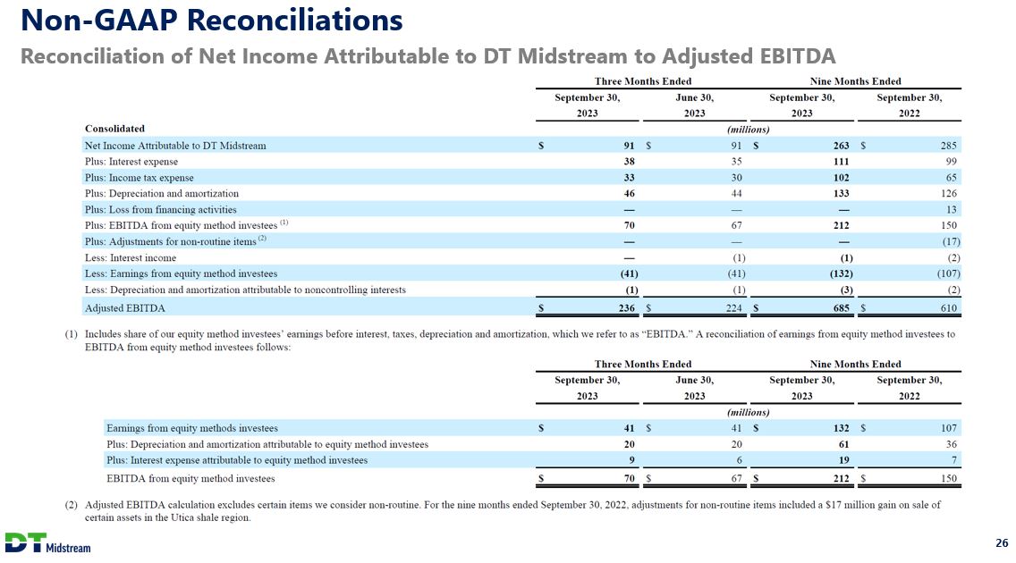 Non - GAAP Reconciliations New slide Reconciliation of Reported to Operating Earnings per diluted share (2) 25 DT MIDSTREAM, INC. RECONCILIATION OF REPORTED TO OPERATING EARNINGS PER DILUTED SHARE (2) (NON-GAAP) THREE MONTHS ENDED -------------------------------------------------------------------------------------- SEPTEMBER 30, JUNE 30, 2023 2023 -------------------------------------------------------------------------------------- REPORTED PRE-TAX INCOME OPERATING REPORTED PRE-TAX INCOME OPERATING ARNINGS DJUSTMENTS AXES ARNINGS AXES ARNINGS E A T (1) EARNINGS E ADJUSTMENTS T (1) E -------------------------------------------------------------------------------------- (PER SHARE) ADJUSTMENTS $ -- $ -- $ -- $ -- --------- ------------ ------- ---------- --------- ------------ ------------------ NET INCOME ATTRIBUTABLE TO$ 0.94 $ -- $ -- $ 0.94 $ 0.93 $ -- $ -- $ 0.93 DT MIDSTREAM ========= ============ ======= ========== ========= ============ ================== NINE MONTHS ENDED ---------------------------------------------------------------------------------------- SEPTEMBER 30, SEPTEMBER 30, 2023 2022 ---------------------------------------------------------------------------------------- REPORTED PRE-TAX INCOME OPERATING REPORTED PRE-TAX INCOME OPERATING ARNINGS DJUSTMENTS AXES ARNINGS DJUSTMENTS AXES E A T (1) EARNINGS E A T (1) EARNINGS ------------------------------------------------------------------ --------------------- (PER SHARE) PENNSYLVANIA INCOME TAX ADJUSTMENT $ -- $ -- $ -- $ (0.26)A GAIN ON SALE -- -- (0.17)B 0.04 --------- ------------ ------- ---------- --------- ------------ -------- ---------- NET INCOME ATTRIBUTABLE $ 2.70 $ -- $ -- $ 2.70 $ 2.94 $ (0.17) $ (0.22) $ 2.55 TO DT MIDSTREAM ========= ============ ======= ========== ========= ============ ======== ========== (1)Excluding tax related adjustments, the amount of income taxes was calculated based on a combined federal and state income tax rate, considering the applicable jurisdictions of the respective segments and deductibility of specific operating adjustments (2)Per share amounts are divided by Weighted Average Common Shares Outstanding -- Diluted, as noted on the Consolidated Statements of Operations ADJUSTMENTS KEY A Pennsylvania state tax rate reduction impact to deferred income tax expense B Gain on sale of certain assets in the Utica shale region -- recorded in Assets (gains) losses and impairments, net
