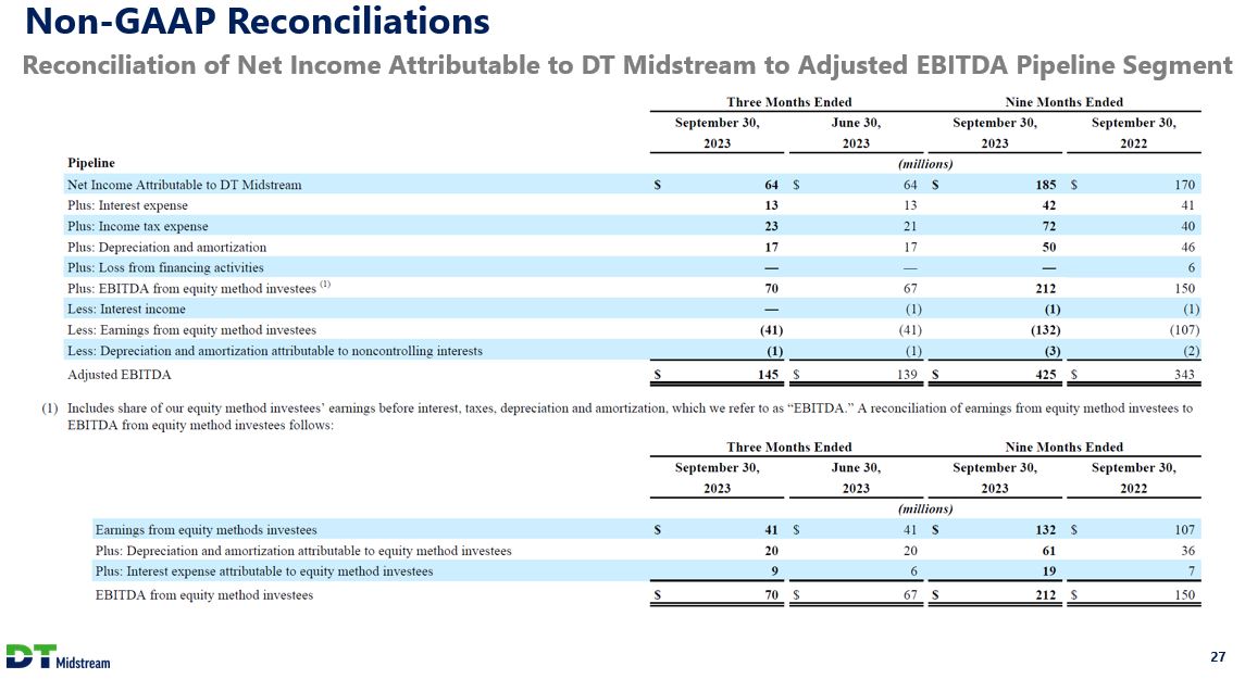 Non - GAAP Reconciliations Reconciliation of Net Income Attributable to DT Midstream to Adjusted EBITDA 26 DT MIDSTREAM, INC. RECONCILIATION OF NET INCOME ATTRIBUTABLE TO DT MIDSTREAM TO ADJUSTED EBITDA (NON-GAAP) THREE MONTHS ENDED NINE MONTHS ENDED ------------------------------- ------------------------------- SEPTEMBER 30, JUNE 30, SEPTEMBER 30, SEPTEMBER 30, 2023 2023 2023 2022 -------------- --------------- -------------- --------------- CONSOLIDATED (MILLIONS) Net Income Attributable to DT Midstream $ 91 $ 91 $ 263 $ 285 Plus: Interest expense 38 35 111 99 Plus: Income tax expense 33 30 102 65 Plus: Depreciation and amortization 46 44 133 126 Plus: Loss from financing activities -- -- -- 13 Plus: EBITDA from equity method investees (1) 70 67 212 150 Plus: Adjustments for non-routine items (2) -- -- -- (17) Less: Interest income -- (1) (1) (2) Less: Earnings from equity method investees (41) (41) (132) (107) Less: Depreciation and amortization attributable to noncontrolling interests (1) (1) (3) (2) ------------- ------------- ------------- -------------- Adjusted EBITDA $ 236 $ 224 $ 685 $ 610 ============= ============= ============= ============== (1)Includes share of our equity method investees' earnings before interest, taxes, depreciation and amortization, which we refer to as "EBITDA." A reconciliation of earnings from equity method investees to EBITDA from equity method investees follows: THREE MONTHS ENDED NINE MONTHS ENDED ------------------------------- ------------------------------- SEPTEMBER 30, JUNE 30, SEPTEMBER 30, SEPTEMBER 30, 2023 2023 2023 2022 -------------- --------------- -------------- --------------- (MILLIONS) Earnings from equity methods investees $ 41 $ 41 $ 132 $ 107 Plus: Depreciation and amortization attributable to equity method investees 20 20 61 36 Plus: Interest expense attributable to equity method investees 9 6 19 7 ------------- ------------- ------------- -------------- EBITDA from equity method investees $ 70 $ 67 $ 212 $ 150 ============= ============= ============= ============== (2)Adjusted EBITDA calculation excludes certain items we consider non-routine. For the nine months ended September 30, 2022, adjustments for non-routine items included a $17 million gain on sale of certain assets in the Utica shale region.