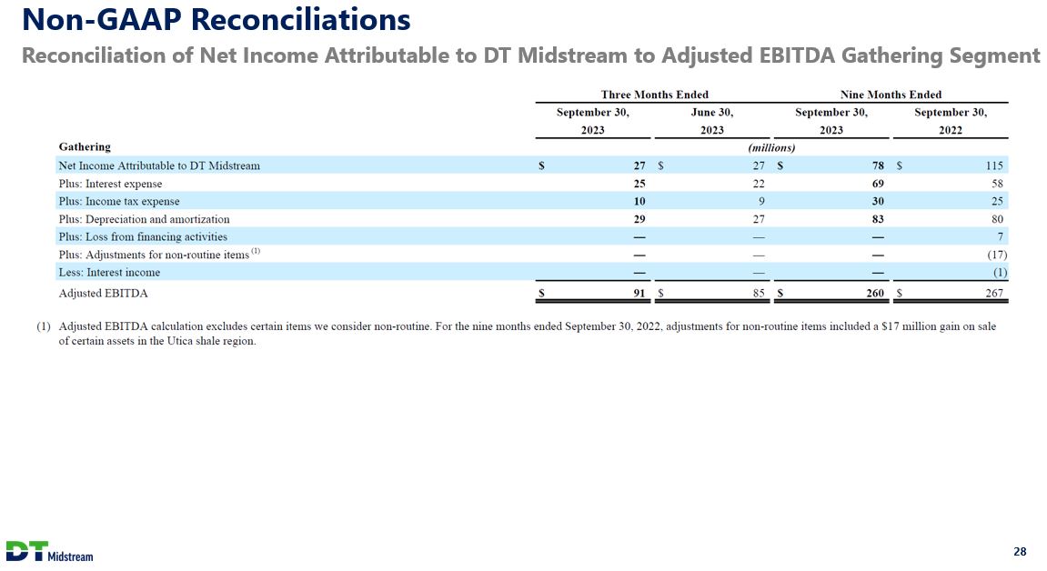 Non - GAAP Reconciliations Reconciliation of Net Income Attributable to DT Midstream to Adjusted EBITDA Pipeline Segment 27 DT MIDSTREAM, INC. RECONCILIATION OF NET INCOME ATTRIBUTABLE TO DT MIDSTREAM TO ADJUSTED EBITDA PIPELINE SEGMENT (NON-GAAP) THREE MONTHS ENDED NINE MONTHS ENDED ------------------------------- ------------------------------- SEPTEMBER 30, JUNE 30, SEPTEMBER 30, SEPTEMBER 30, 2023 2023 2023 2022 -------------- --------------- -------------- --------------- PIPELINE (MILLIONS) Net Income Attributable to DT Midstream $ 64 $ 64 $ 185 $ 170 Plus: Interest expense 13 13 42 41 Plus: Income tax expense 23 21 72 40 Plus: Depreciation and amortization 17 17 50 46 Plus: Loss from financing activities -- -- -- 6 Plus: EBITDA from equity method investees (1) 70 67 212 150 Less: Interest income -- (1) (1) (1) Less: Earnings from equity method investees (41) (41) (132) (107) Less: Depreciation and amortization attributable to noncontrolling interests (1) (1) (3) (2) ------------- ------------- ------------- -------------- Adjusted EBITDA $ 145 $ 139 $ 425 $ 343 ============= ============= ============= ============== (1)Includes share of our equity method investees' earnings before interest, taxes, depreciation and amortization, which we refer to as "EBITDA." A reconciliation of earnings from equity method investees to EBITDA from equity method investees follows: THREE MONTHS ENDED NINE MONTHS ENDED ------------------------------- ------------------------------- SEPTEMBER 30, JUNE 30, SEPTEMBER 30, SEPTEMBER 30, 2023 2023 2023 2022 -------------- --------------- -------------- --------------- (MILLIONS) Earnings from equity methods investees $ 41 $ 41 $ 132 $ 107 Plus: Depreciation and amortization attributable to equity method investees 20 20 61 36 Plus: Interest expense attributable to equity method investees 9 $ 6 19 7 ------------- ------------- ------------- -------------- EBITDA from equity method investees $ 70 $ 67 $ 212 $ 150