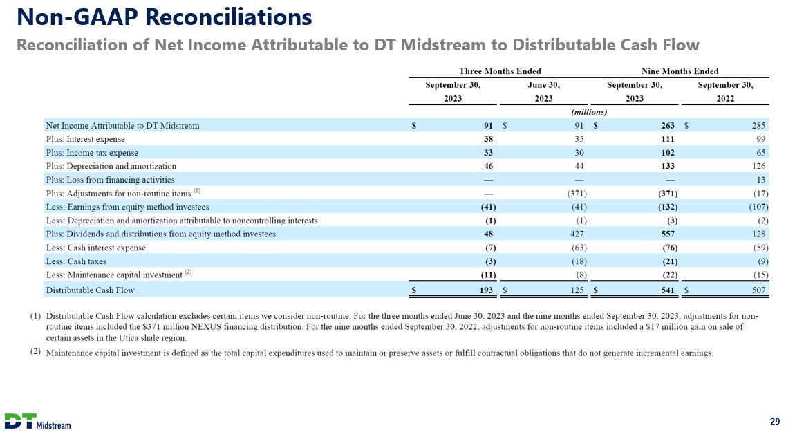 Non - GAAP Reconciliations Reconciliation of Net Income Attributable to DT Midstream to Adjusted EBITDA Gathering Segment 28 DT MIDSTREAM, INC. RECONCILIATION OF NET INCOME ATTRIBUTABLE TO DT MIDSTREAM TO ADJUSTED EBITDA GATHERING SEGMENT (NON-GAAP) THREE MONTHS ENDED NINE MONTHS ENDED ------------------------------- ------------------------------- SEPTEMBER 30, JUNE 30, SEPTEMBER 30, SEPTEMBER 30, 2023 2023 2023 2022 -------------- --------------- -------------- --------------- GATHERING (MILLIONS) Net Income Attributable to DT Midstream $ 27 $ 27 $ 78 $ 115 Plus: Interest expense 25 22 69 58 Plus: Income tax expense 10 9 30 25 Plus: Depreciation and amortization 29 27 83 80 Plus: Loss from financing activities -- -- -- 7 Plus: Adjustments for non-routine items (1) -- -- -- (17) Less: Interest income -- -- -- (1) ------------- ------------- ------------- -------------- Adjusted EBITDA $ 91 $ 85 $ 260 $ 267 ============= ============= ============= ============== (1)Adjusted EBITDA calculation excludes certain items we consider non-routine. For the nine months ended September 30, 2022, adjustments for non-routine items included a $17 million gain on sale of certain assets in the Utica shale region.