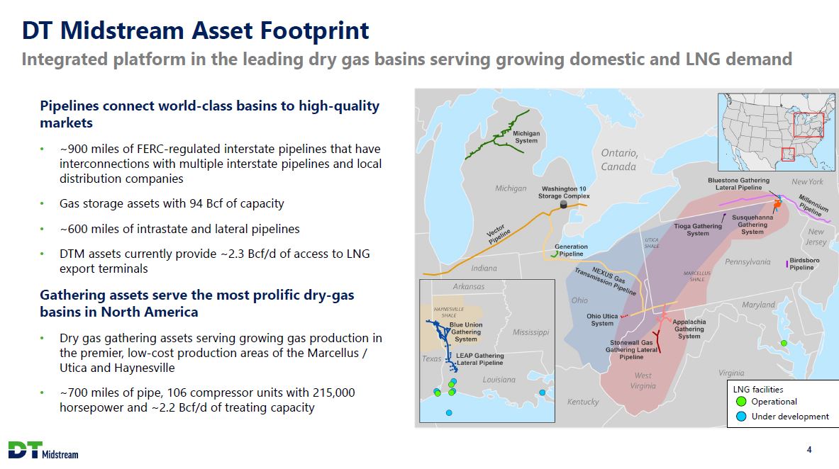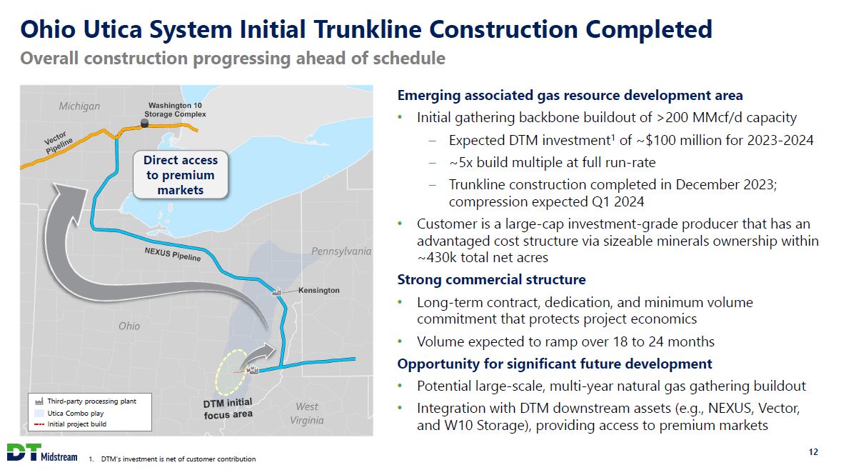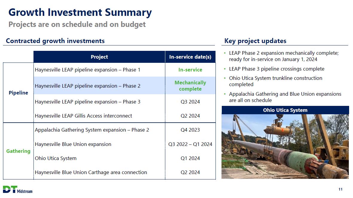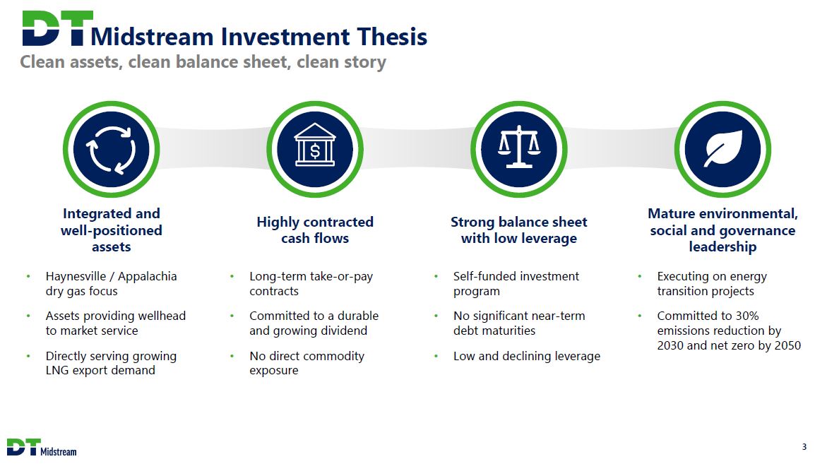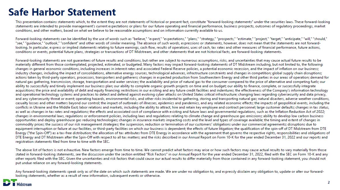 Safe Harbor Statement This presentation contains statements which, to the extent they are not statements of historical or present fact, constitute "forward-looking statements" under the securities laws. These forward-looking statements are intended to provide management's current expectations or plans for our future operating and financial performance, business prospects, outcomes of regulatory proceedings, market conditions, and other matters, based on what we believe to be reasonable assumptions and on information currently available to us. Forward-looking statements can be identified by the use of words such as "believe," "expect," "expectations," "plans," "strategy," "prospects," "estimate," "project," "target," "anticipate," "will," "should," "see," "guidance," "outlook," "confident" and other words of similar meaning. The absence of such words, expressions or statements, however, does not mean that the statements are not forward-looking. In particular, express or implied statements relating to future earnings, cash flow, results of operations, uses of cash, tax rates and other measures of financial performance, future actions, conditions or events, potential future plans, strategies or transactions of DT Midstream, and other statements that are not historical facts, are forward-looking statements. Forward-looking statements are not guarantees of future results and conditions, but rather are subject to numerous assumptions, risks, and uncertainties that may cause actual future results to be materially different from those contemplated, projected, estimated, or budgeted. Many factors may impact forward-looking statements of DT Midstream including, but not limited to, the following: changes in general economic conditions, including increases in interest rates and associated Federal Reserve policies, a potential economic recession, and the impact of inflation on our business; industry changes, including the impact of consolidations, alternative energy sources, technological advances, infrastructure constraints and changes in competition; global supply chain disruptions; actions taken by third-party operators, processors, transporters and gatherers; changes in expected production from Southwestern Energy and other third parties in our areas of operation; demand for natural gas gathering, transmission, storage, transportation and water services; the availability and price of natural gas to the consumer compared to the price of alternative and competing fuels; our ability to successfully and timely implement our business plan; our ability to complete organic growth projects on time and on budget; our ability to finance, complete, or successfully integrate acquisitions; the price and availability of debt and equity financing; restrictions in our existing and any future credit facilities and indentures; the effectiveness of the Company's information technology and operational technology systems and practices to detect and defend against evolving cyber attacks on United States critical infrastructure; changing laws regarding cybersecurity and data privacy, and any cybersecurity threat or event; operating hazards, environmental risks, and other risks incidental to gathering, storing and transporting natural gas; natural disasters, adverse weather conditions, casualty losses and other matters beyond our control; the impact of outbreaks of illnesses, epidemics and pandemics, and any related economic effects; the impacts of geopolitical events, including the conflicts in Ukraine and the Middle East; labor relations and markets, including the ability to attract, hire and retain key employee and contract personnel; large customer defaults; changes in tax status, as well as changes in tax rates and regulations; the effects and associated cost of compliance with existing and future laws and governmental regulations, such as the Inflation Reduction Act of 2022; changes in environmental laws, regulations or enforcement policies, including laws and regulations relating to climate change and greenhouse gas emissions; ability to develop low carbon business opportunities and deploy greenhouse gas reducing technologies; changes in insurance markets impacting costs and the level and types of coverage available; the timing and extent of changes in commodity prices; the success of our risk management strategies; the suspension, reduction or termination of our customers' obligations under our commercial agreements; disruptions due to equipment interruption or failure at our facilities, or third-party facilities on which our business is dependent; the effects of future litigation; the qualification of the spin-off of DT Midstream from DTE Energy ("the Spin-Off") as a tax-free distribution; the allocation of tax attributes from DTE Energy in accordance with the agreement that governs the respective rights, responsibilities and obligations of DTE Energy and DT Midstream after the Spin-Off with respect to all tax matters; and the risks described in our Annual Report on Form 10-K for the year ended December 31, 2022 and our reports and registration statements filed from time to time with the SEC. The above list of factors is not exhaustive. New factors emerge from time to time. We cannot predict what factors may arise or how such factors may cause actual results to vary materially from those stated in forward-looking statements, see the discussion under the section entitled "Risk Factors" in our Annual Report for the year ended December 31, 2022, filed with the SEC on Form 10-K and any other reports filed with the SEC. Given the uncertainties and risk factors that could cause our actual results to differ materially from those contained in any forward-looking statement, you should not put undue reliance on any forward-looking statements. Any forward-looking statements speak only as of the date on which such statements are made. We are under no obligation to, and expressly disclaim any obligation to, update or alter 