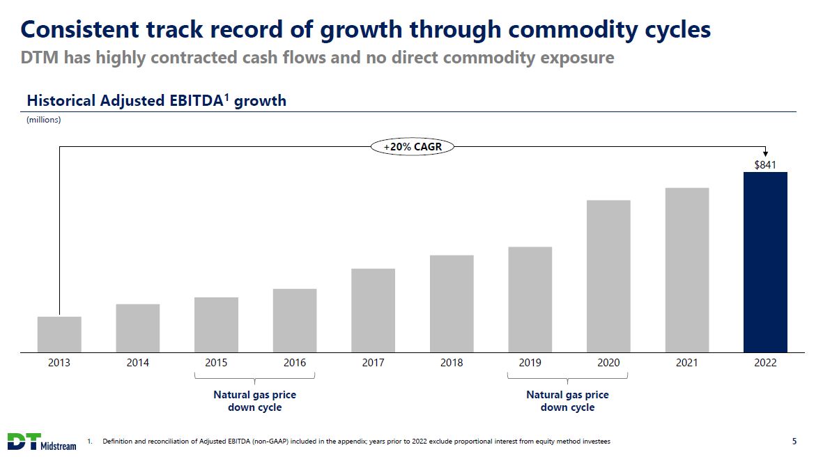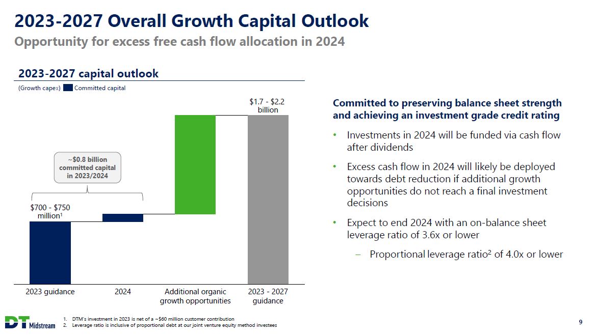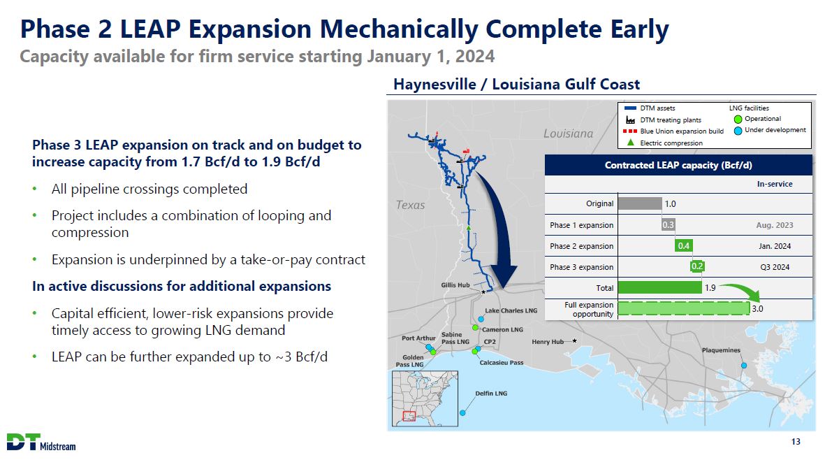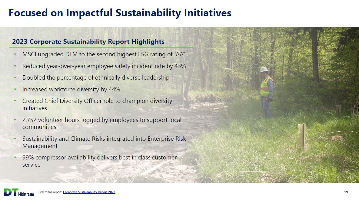 Safe Harbor Statement This presentation contains statements which, to the extent they are not statements of historical or present fact, constitute "forward-looking statements" under the securities laws. These forward-looking statements are intended to provide management's current expectations or plans for our future operating and financial performance, business prospects, outcomes of regulatory proceedings, market conditions, and other matters, based on what we believe to be reasonable assumptions and on information currently available to us. Forward-looking statements can be identified by the use of words such as "believe," "expect," "expectations," "plans," "strategy," "prospects," "estimate," "project," "target," "anticipate," "will," "should," "see," "guidance," "outlook," "confident" and other words of similar meaning. The absence of such words, expressions or statements, however, does not mean that the statements are not forward-looking. In particular, express or implied statements relating to future earnings, cash flow, results of operations, uses of cash, tax rates and other measures of financial performance, future actions, conditions or events, potential future plans, strategies or transactions of DT Midstream, and other statements that are not historical facts, are forward-looking statements. Forward-looking statements are not guarantees of future results and conditions, but rather are subject to numerous assumptions, risks, and uncertainties that may cause actual future results to be materially different from those contemplated, projected, estimated, or budgeted. Many factors may impact forward-looking statements of DT Midstream including, but not limited to, the following: changes in general economic conditions, including increases in interest rates and associated Federal Reserve policies, a potential economic recession, and the impact of inflation on our business; industry changes, including the impact of consolidations, alternative energy sources, technological advances, infrastructure constraints and changes in competition; global supply chain disruptions; actions taken by third-party operators, processors, transporters and gatherers; changes in expected production from Southwestern Energy and other third parties in our areas of operation; demand for natural gas gathering, transmission, storage, transportation and water services; the availability and price of natural gas to the consumer compared to the price of alternative and competing fuels; our ability to successfully and timely implement our business plan; our ability to complete organic growth projects on time and on budget; our ability to finance, complete, or successfully integrate acquisitions; the price and availability of debt and equity financing; restrictions in our existing and any future credit facilities and indentures; the effectiveness of the Company's information technology and operational technology systems and practices to detect and defend against evolving cyber attacks on United States critical infrastructure; changing laws regarding cybersecurity and data privacy, and any cybersecurity threat or event; operating hazards, environmental risks, and other risks incidental to gathering, storing and transporting natural gas; natural disasters, adverse weather conditions, casualty losses and other matters beyond our control; the impact of outbreaks of illnesses, epidemics and pandemics, and any related economic effects; the impacts of geopolitical events, including the conflicts in Ukraine and the Middle East; labor relations and markets, including the ability to attract, hire and retain key employee and contract personnel; large customer defaults; changes in tax status, as well as changes in tax rates and regulations; the effects and associated cost of compliance with existing and future laws and governmental regulations, such as the Inflation Reduction Act of 2022; changes in environmental laws, regulations or enforcement policies, including laws and regulations relating to climate change and greenhouse gas emissions; ability to develop low carbon business opportunities and deploy greenhouse gas reducing technologies; changes in insurance markets impacting costs and the level and types of coverage available; the timing and extent of changes in commodity prices; the success of our risk management strategies; the suspension, reduction or termination of our customers' obligations under our commercial agreements; disruptions due to equipment interruption or failure at our facilities, or third-party facilities on which our business is dependent; the effects of future litigation; the qualification of the spin-off of DT Midstream from DTE Energy ("the Spin-Off") as a tax-free distribution; the allocation of tax attributes from DTE Energy in accordance with the agreement that governs the respective rights, responsibilities and obligations of DTE Energy and DT Midstream after the Spin-Off with respect to all tax matters; and the risks described in our Annual Report on Form 10-K for the year ended December 31, 2022 and our reports and registration statements filed from time to time with the SEC. The above list of factors is not exhaustive. New factors emerge from time to time. We cannot predict what factors may arise or how such factors may cause actual results to vary materially from those stated in forward-looking statements, see the discussion under the section entitled "Risk Factors" in our Annual Report for the year ended December 31, 2022, filed with the SEC on Form 10-K and any other reports filed with the SEC. Given the uncertainties and risk factors that could cause our actual results to differ materially from those contained in any forward-looking statement, you should not put undue reliance on any forward-looking statements. Any forward-looking statements speak only as of the date on which such statements are made. We are under no obligation to, and expressly disclaim any obligation to, update or alter 