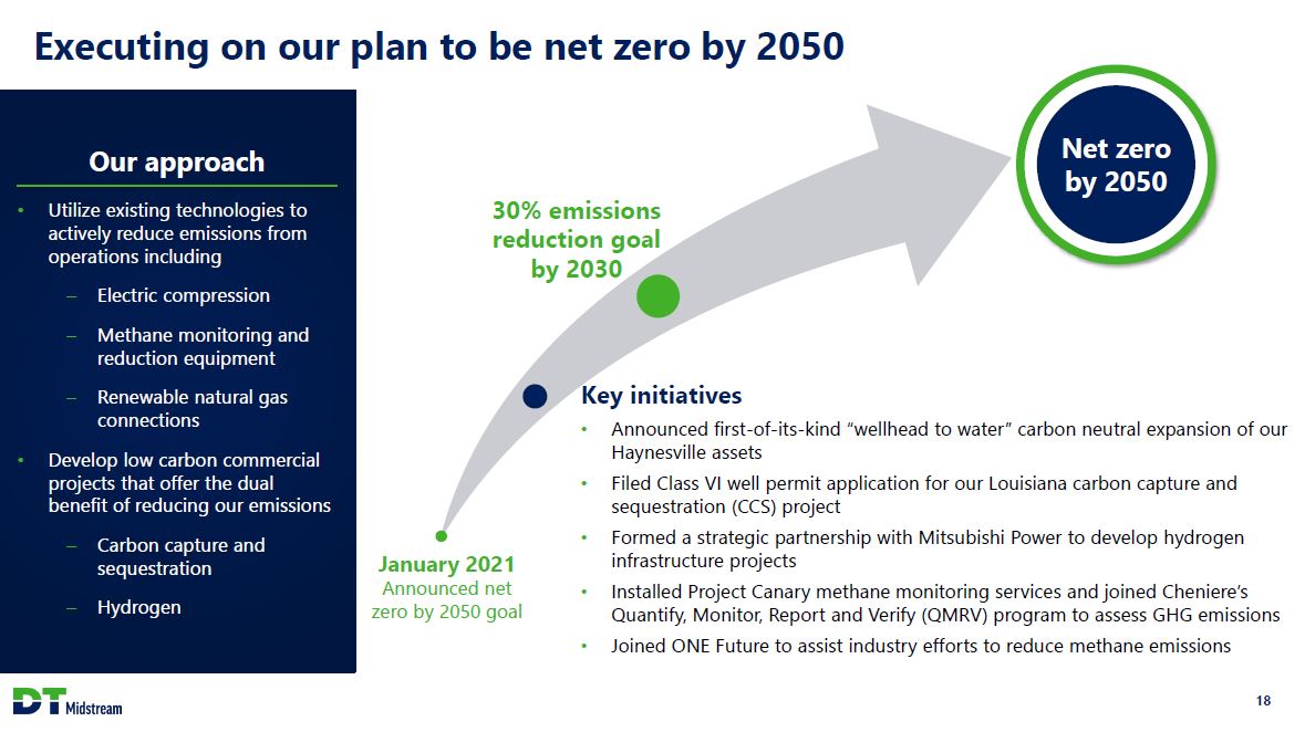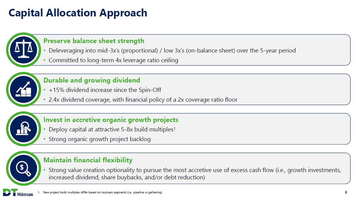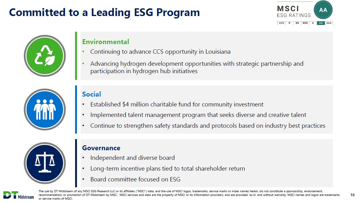 DT Midstream Investment Thesis Clean assets, clean balance sheet, clean story Integrated and well-positioned assets Haynesville / Appalachia dry gas focus Assets providing wellhead to market service Directly serving growing LNG export demand Highly contracted cash flows Long-term take-or-pay contracts Committed to a durable and growing dividend No direct commodity exposure Strong balance sheet with low leverage Self-funded investment program No significant near-term debt maturities Low and declining leverage Mature environmental, social and governance leadership Executing on energy transition projects Committed to 30% emissions reduction by 2030 and net zero by 2050 3