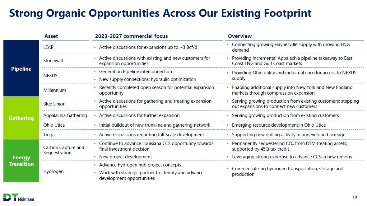 2023-2027 Overall Growth Capital Outlook Opportunity for excess free cash flow allocation in 2024 2023-2027 capital outlook (Growth capex) Committed capital ~$0.8 billion committed capital in 2023/2024 $700 - $750 million1 2023 guidance 2024 Additional organic growth opportunities. $1.7 - $2.2 billion 2023 - 2027 guidance Committed to preserving balance sheet strength and achieving an investment grade credit rating Investments in 2024 will be funded via cash flow after dividends Excess cash flow in 2024 will likely be deployed towards debt reduction if additional growth opportunities do not reach a final investment decisions Expect to end 2024 with an on-balance sheet leverage ratio of 3.6x or lower Proportional leverage ratio2 of 4.0x or lower 1. DTM's investment in 2023 is net of a ~$60 million customer contribution 2. Leverage ratio is inclusive of proportional debt at our joint venture equity method investees 9