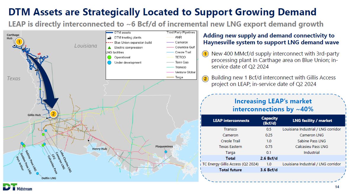 Phase 2 LEAP Expansion Mechanically Complete Early Capacity available for firm service starting January 1, 2024 Phase 3 LEAP expansion on-track and on-budget to increase capacity from 1.7 Bcf/d to 1.9 Bcf/d All pipeline crossings completed Project includes a combination of looping and compression Expansion is underpinned by a take-or-pay contract In active discussions for additional expansions Capital efficient, lower-risk expansions provide timely access to growing LNG demand LEAP can be further expanded up to ~3 Bcf/d Haynesville / Louisiana Gulf Coast DTM assets DTM treating plants Blue Union expansion build Electric compression LNG facilities Operational Under development Contracted LEAP capacity (Bcf/d) Original 1.0 Phase 1 expansion 0.3 Phase 2 expansion 0.4 Phase 3 expansion 0.2 Total 1.9 Full expansion opportunity 3.0 In-service Aug. 2023 Jan. 2024 Q3 2024 13