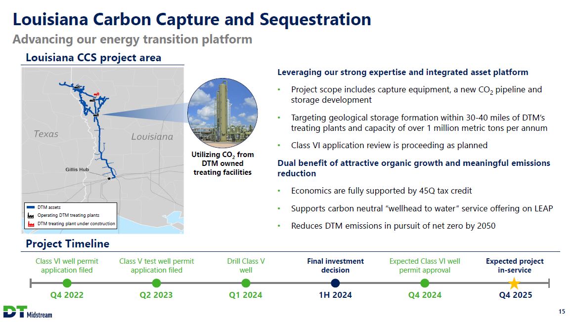 DTM Assets are Strategically Located to Support Growing Demand LEAP is directly interconnected to ~6 Bcf/d of incremental new LNG export demand growth 1 2 Adding new supply and demand connectivity to Haynesville system to support LNG demand wave 1 New 400 MMcf/d supply interconnect with 3rd-party processing plant in Carthage area on Blue Union; in-service date of Q2 2024 2 Building new 1 Bcf/d interconnect with Gillis Access project on LEAP; in-service date of Q2 2024 Increasing LEAP's market interconnections by ~40% LEAP interconnects Capacity (Bcf/d) LNG facility / market Transco 0.5 Louisiana Industrial / LNG corridor Cameron 0.25 Cameron LNG Creole Trail 1.0 Sabine Pass LNG Texas Eastern 0.75 Calcasieu Pass LNG Targa 0.1 Industrial Total 2.6 Bcf/d TC Energy Gillis Access (Q2 2024) 1.0 Louisiana Industrial / LNG corridor Total future 3.6 Bcf/d 14