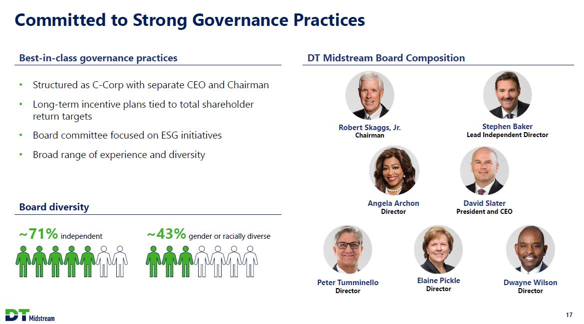 Committed to a Leading ESG Program Environmental Continuing to advance CCS opportunity in Louisiana Advancing hydrogen development opportunities with strategic partnership and participation in hydrogen hub initiatives Social Established $4 million charitable fund for community investment Implemented talent management program that seeks diverse and creative talent Continue to strengthen safety standards and protocols based on industry best practices Governance Independent and diverse board Long-term incentive plans tied to total shareholder return Board committee focused on ESG The use by DT Midstream of any MSCI ESG Research LLC or its affiliates ("MSCI") data, and the use of MSCI logos, trademarks, service marks or index names herein, do not constitute a sponsorship, endorsement, recommendation, or promotion of DT Midstream by MSCI. MSCI services and data are the property of MSCI or its information providers, and are provided 'as-is' and without warranty. MSCI names and logos are trademarks or service marks of MSCI. 16