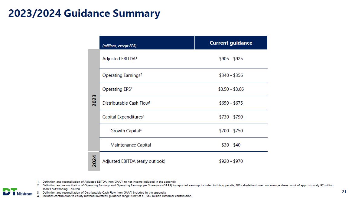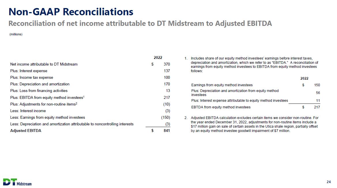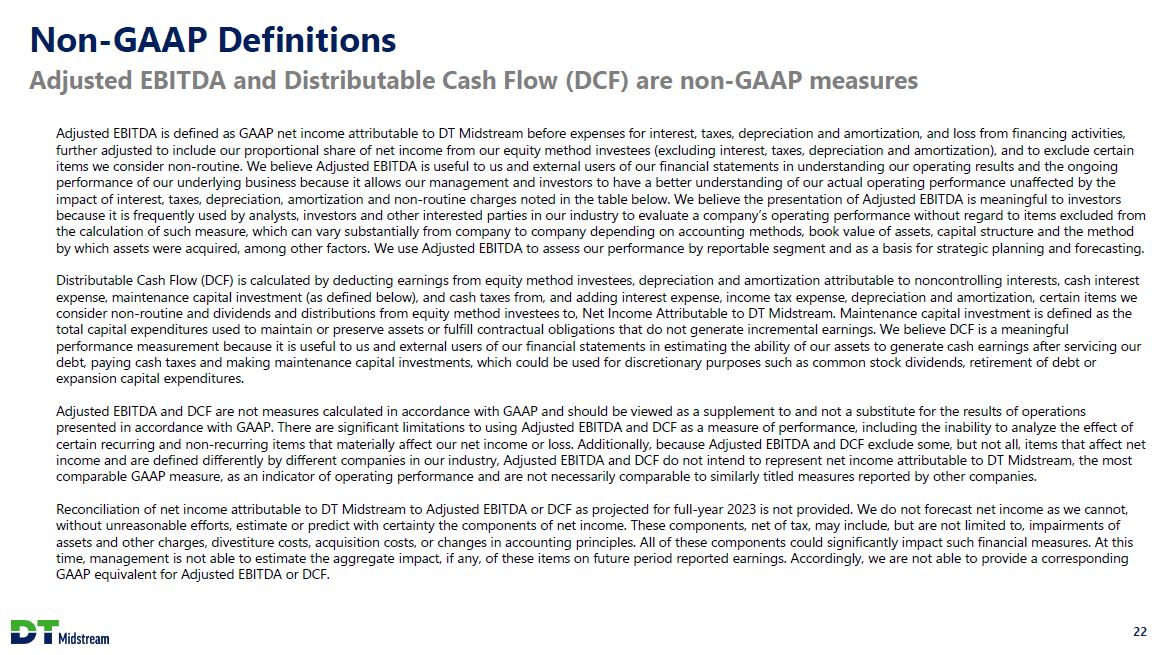 Non-GAAP Definitions Adjusted EBITDA and Distributable Cash Flow (DCF) are non-GAAP measures Adjusted EBITDA is defined as GAAP net income attributable to DT Midstream before expenses for interest, taxes, depreciation and amortization, and loss from financing activities, further adjusted to include our proportional share of net income from our equity method investees (excluding interest, taxes, depreciation and amortization), and to exclude certain items we consider non-routine. We believe Adjusted EBITDA is useful to us and external users of our financial statements in understanding our operating results and the ongoing performance of our underlying business because it allows our management and investors to have a better understanding of our actual operating performance unaffected by the impact of interest, taxes, depreciation, amortization and non-routine charges noted in the table below. We believe the presentation of Adjusted EBITDA is meaningful to investors because it is frequently used by analysts, investors and other interested parties in our industry to evaluate a company's operating performance without regard to items excluded from the calculation of such measure, which can vary substantially from company to company depending on accounting methods, book value of assets, capital structure and the method by which assets were acquired, among other factors. We use Adjusted EBITDA to assess our performance by reportable segment and as a basis for strategic planning and forecasting. Distributable Cash Flow (DCF) is calculated by deducting earnings from equity method investees, depreciation and amortization attributable to noncontrolling interests, cash interest expense, maintenance capital investment (as defined below), and cash taxes from, and adding interest expense, income tax expense, depreciation and amortization, certain items we consider non-routine and dividends and distributions from equity method investees to, Net Income Attributable to DT Midstream. Maintenance capital investment is defined as the total capital expenditures used to maintain or preserve assets or fulfill contractual obligations that do not generate incremental earnings. We believe DCF is a meaningful performance measurement because it is useful to us and external users of our financial statements in estimating the ability of our assets to generate cash earnings after servicing our debt, paying cash taxes and making maintenance capital investments, which could be used for discretionary purposes such as common stock dividends, retirement of debt or expansion capital expenditures. Adjusted EBITDA and DCF are not measures calculated in accordance with GAAP and should be viewed as a supplement to and not a substitute for the results of operations presented in accordance with GAAP. There are significant limitations to using Adjusted EBITDA and DCF as a measure of performance, including the inability to analyze the effect of certain recurring and non-recurring items that materially affect our net income or loss. Additionally, because Adjusted EBITDA and DCF exclude some, but not all, items that affect net income and are defined differently by different companies in our industry, Adjusted EBITDA and DCF do not intend to represent net income attributable to DT Midstream, the most comparable GAAP measure, as an indicator of operating performance and are not necessarily comparable to similarly titled measures reported by other companies. Reconciliation of net income attributable to DT Midstream to Adjusted EBITDA or DCF as projected for full-year 2023 is not provided. We do not forecast net income as we cannot, without unreasonable efforts, estimate or predict with certainty the components of net income. These components, net of tax, may include, but are not limited to, impairments of assets and other charges, divestiture costs, acquisition costs, or changes in accounting principles. All of these components could significantly impact such financial measures. At this time, management is not able to estimate the aggregate impact, if any, of these items on future period reported earnings. Accordingly, we are not able to provide a corresponding GAAP equivalent for Adjusted EBITDA or DCF. 22