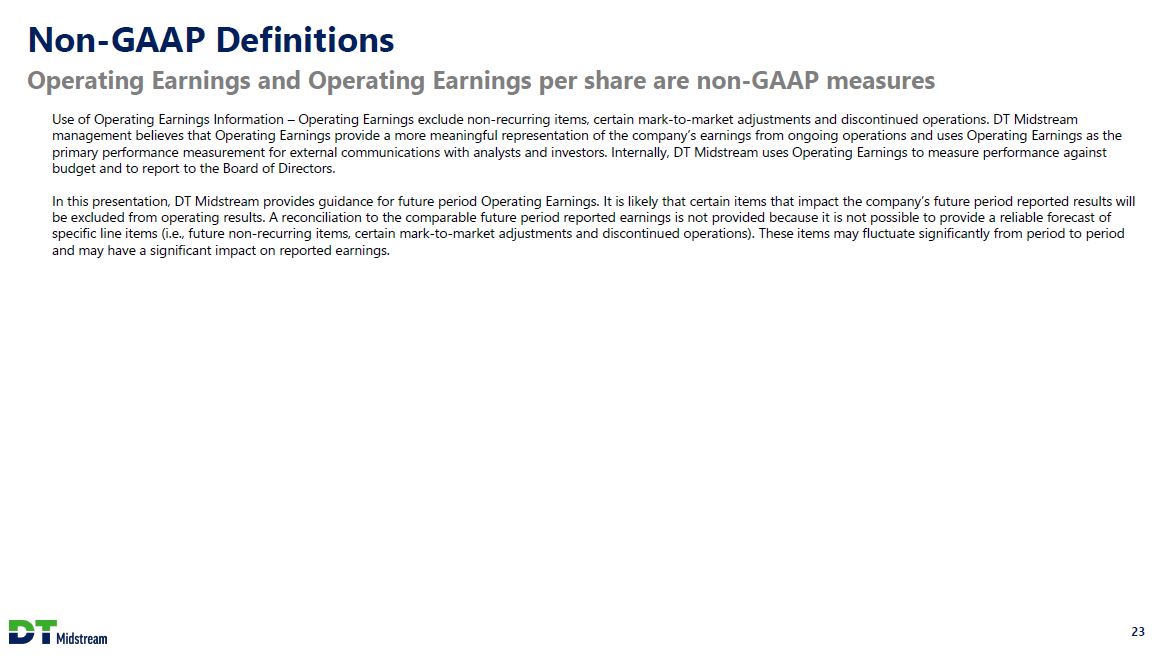 Non-GAAP Definitions Operating Earnings and Operating Earnings per share are non-GAAP measures Use of Operating Earnings Information - Operating Earnings exclude non-recurring items, certain mark-to-market adjustments and discontinued operations. DT Midstream management believes that Operating Earnings provide a more meaningful representation of the company's earnings from ongoing operations and uses Operating Earnings as the primary performance measurement for external communications with analysts and investors. Internally, DT Midstream uses Operating Earnings to measure performance against budget and to report to the Board of Directors. In this presentation, DT Midstream provides guidance for future period Operating Earnings. It is likely that certain items that impact the company's future period reported results will be excluded from operating results. A reconciliation to the comparable future period reported earnings is not provided because it is not possible to provide a reliable forecast of specific line items (i.e., future non-recurring items, certain mark-to-market adjustments and discontinued operations). These items may fluctuate significantly from period to period and may have a significant impact on reported earnings. 23