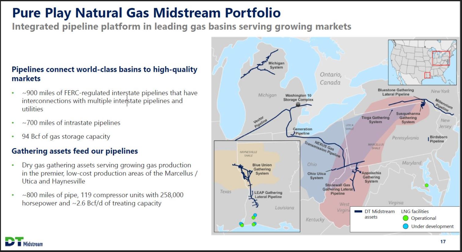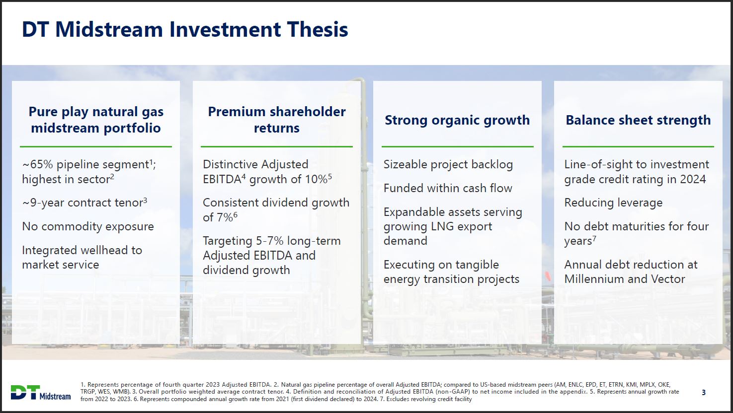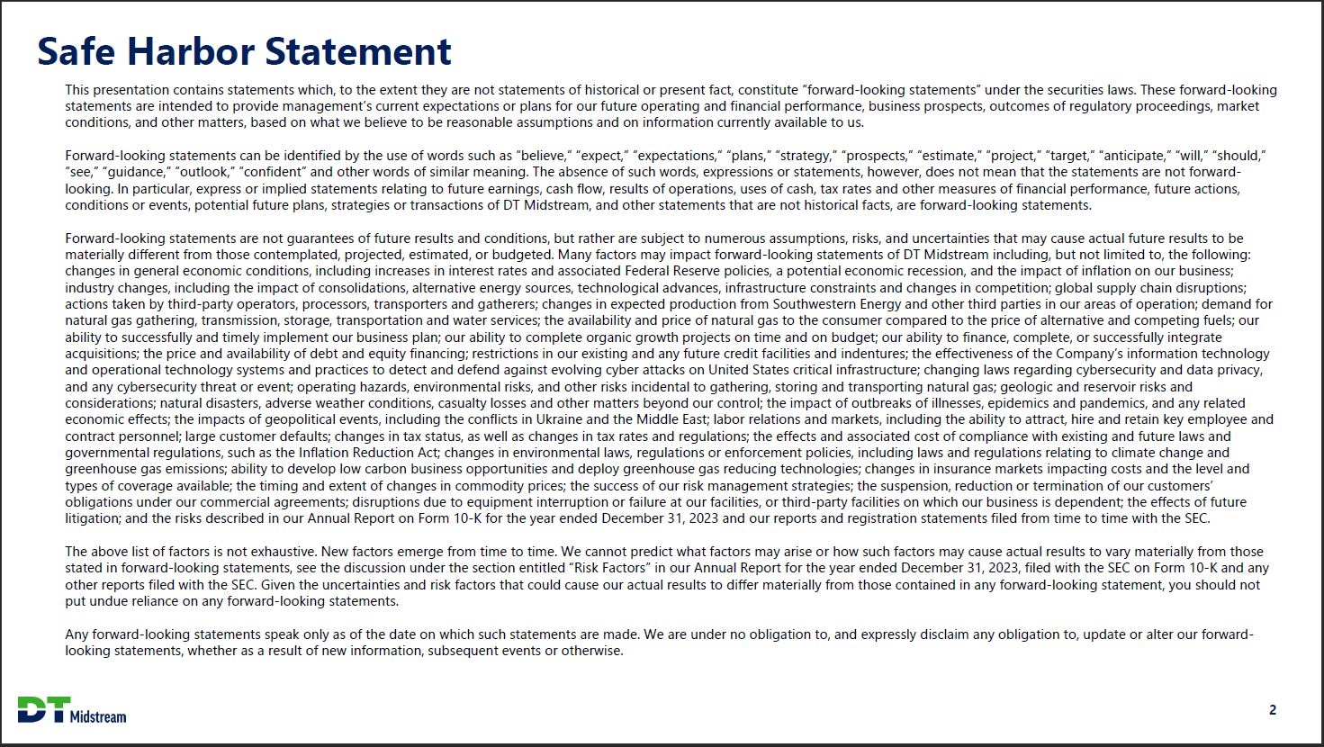 Safe Harbor Statement This presentation contains statements which, to the extent they are not statements of historical or present fact, constitute "forward looking statements" under the securities laws. These forward looking statements are intended to provide management's current expectations or plans for our future operating and financial performance, business prospects, outcomes of regulatory proceedings, market conditions, and other matters, based on what we believe to be reasonable assumptions and on information currently available to us. Forward-looking statements can be identified by the use of words such as "believe," "expect," "expectations," "plans," "strategy," "prospects," "estimate," "project," "target," "anticipate," "will," "should," "see," "guidance," "outlook," "confident" and other words of similar meaning. The absence of such words, expressions or statements, however, does not mean that the statements are not forward-looking. In particular, express or implied statements relating to future earnings, cash flow, results of operations, uses of cash, tax rates and other measures of financial performance, future actions, conditions or events, potential future plans, strategies or transactions of DT Midstream, and other statements that are not historical facts, are forward looking statements. Forward-looking statements are not guarantees of future results and conditions, but rather are subject to numerous assumptions, risks, and uncertainties that may cause actual future results to be materially different from those contemplated, projected, estimated, or budgeted. Many factors may impact forward looking statements of DT Midstream including, but not limited to, the following: changes in general economic conditions, including increases in interest rates and associated Federal Reserve policies, a potential economic recession, and the impact of inflation on our business; industry changes, including the impact of consolidations, alternative energy sources, technological advances, infrastructure constraints and changes in competition; global supply chain disruptions; actions taken by third party operators, processors, transporters and gatherers; changes in expected production from Southwestern Energy and other third parties in our areas of operation; demand for natural gas gathering, transmission, storage, transportation and water services; the availability and price of natural gas to the consumer compared to the price of alternative and competing fuels; our ability to successfully and timely implement our business plan; our ability to complete organic growth projects on time and on budget; our ability to finance, complete, or successfully integrate acquisitions; the price and availability of debt and equity financing; restrictions in our existing and any future credit facilities and indentures; the effectiveness of the Company's information technology and operational technology systems and practices to detect and defend against evolving cyber attacks on United States critical infrastructure; changing laws regarding cybersecurity and data privacy, and any cybersecurity threat or event; operating hazards, environmental risks, and other risks incidental to gathering, storing and transporting natural gas; geologic and reservoir risks and considerations; natural disasters, adverse weather conditions, casualty losses and other matters beyond our control; the impact of outbreaks of illnesses, epidemics and pandemics, and any related economic effects; the impacts of geopolitical events, including the conflicts in Ukraine and the Middle East; labor relations an d markets, including the ability to attract, hire and retain key employee and contract personnel; large customer defaults; changes in tax status, as well as changes in tax rates and regulations; the effects and associated cost of compliance with existing and future laws and governmental regulations, such as the Inflation Reduction Act; changes in environmental laws, regulations or enforcement policies, including laws and regulations relating to climate change and greenhouse gas emissions; ability to develop low carbon business opportunities and deploy greenhouse gas reducing technologies; changes in insurance markets impacting costs and the level and types of coverage available; the timing and extent of changes in commodity prices; the success of our risk management strategies ; the suspension, reduction or termination of our customers' obligations under our commercial agreements; disruptions due to equipment interruption or failure at our facilities, or third party facilities on which our business is dependent; the effects of future litigation; and the risks described in our Annual Report on Form 10 K for the year ended December 31, 2023 and our reports and registration statements filed from time to time with the SEC. The above list of factors is not exhaustive. New factors emerge from time to time. We cannot predict what factors may arise or how such factors may cause actual results to vary materially from those stated in forward looking statements, see the discussion under the section entitled "Risk Factors" in our Annual Report for the year ended December 31, 2023, filed with the SEC on Form 10 K and any other reports filed with the SEC. Given the uncertainties and risk factors that could cause our actual results to differ materially from those contained in any forward -looking statement, you should not put undue reliance on any forward-looking statements. Any forward-looking statements speak only as of the date on which such statements are made. We are under no obligation to, and expressly disclaim any obligation to, update or alter our forward-looking statements, whether as a result of new information, subsequent events or otherwise. DT Midstream 2