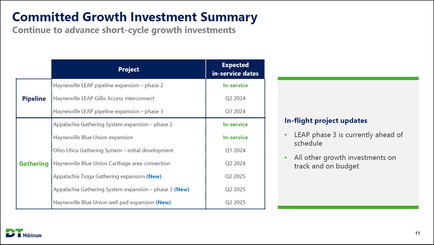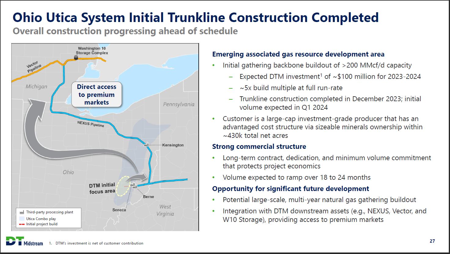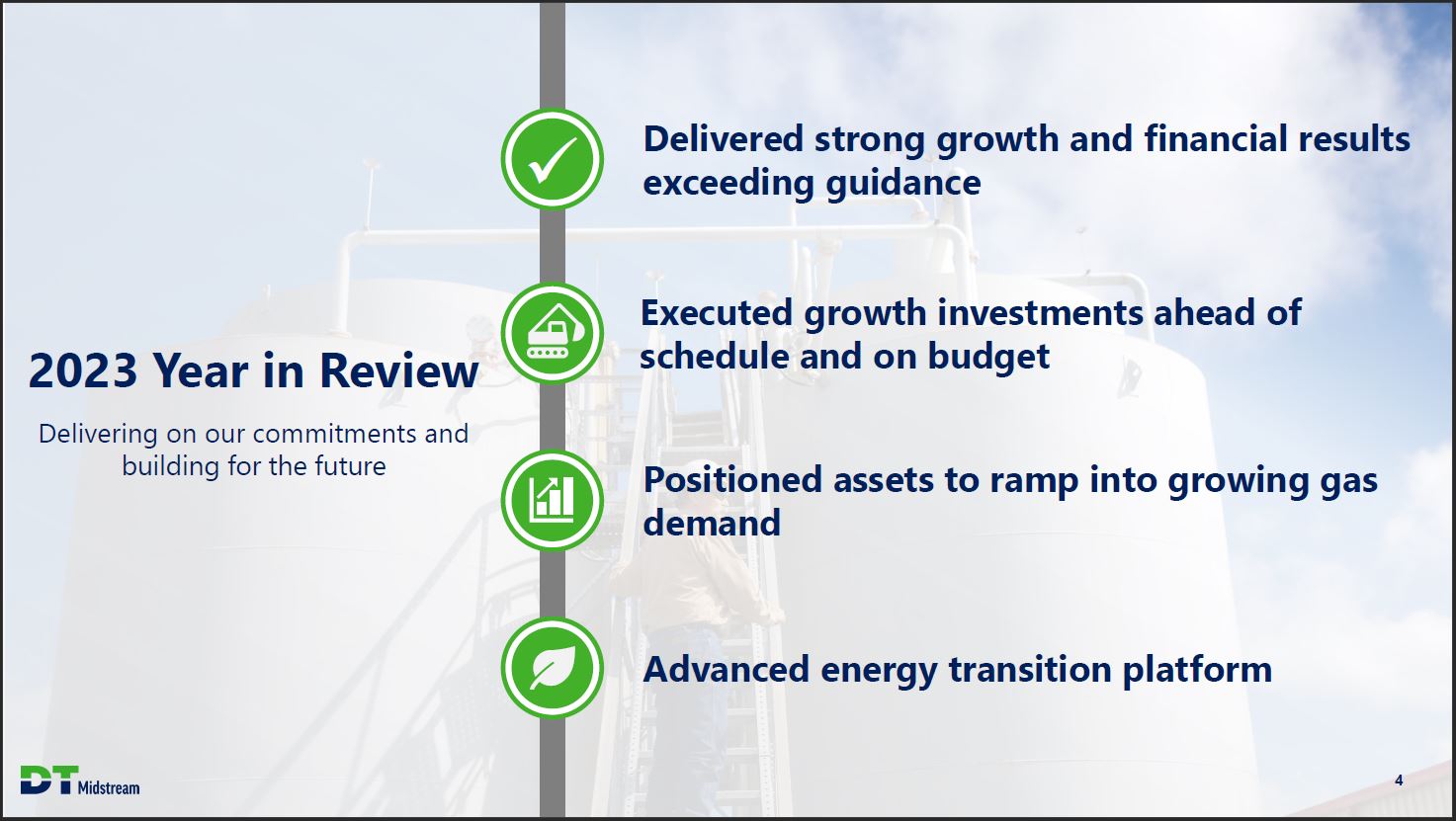 Safe Harbor Statement This presentation contains statements which, to the extent they are not statements of historical or present fact, constitute "forward looking statements" under the securities laws. These forward looking statements are intended to provide management's current expectations or plans for our future operating and financial performance, business prospects, outcomes of regulatory proceedings, market conditions, and other matters, based on what we believe to be reasonable assumptions and on information currently available to us. Forward-looking statements can be identified by the use of words such as "believe," "expect," "expectations," "plans," "strategy," "prospects," "estimate," "project," "target," "anticipate," "will," "should," "see," "guidance," "outlook," "confident" and other words of similar meaning. The absence of such words, expressions or statements, however, does not mean that the statements are not forward-looking. In particular, express or implied statements relating to future earnings, cash flow, results of operations, uses of cash, tax rates and other measures of financial performance, future actions, conditions or events, potential future plans, strategies or transactions of DT Midstream, and other statements that are not historical facts, are forward looking statements. Forward-looking statements are not guarantees of future results and conditions, but rather are subject to numerous assumptions, risks, and uncertainties that may cause actual future results to be materially different from those contemplated, projected, estimated, or budgeted. Many factors may impact forward looking statements of DT Midstream including, but not limited to, the following: changes in general economic conditions, including increases in interest rates and associated Federal Reserve policies, a potential economic recession, and the impact of inflation on our business; industry changes, including the impact of consolidations, alternative energy sources, technological advances, infrastructure constraints and changes in competition; global supply chain disruptions; actions taken by third party operators, processors, transporters and gatherers; changes in expected production from Southwestern Energy and other third parties in our areas of operation; demand for natural gas gathering, transmission, storage, transportation and water services; the availability and price of natural gas to the consumer compared to the price of alternative and competing fuels; our ability to successfully and timely implement our business plan; our ability to complete organic growth projects on time and on budget; our ability to finance, complete, or successfully integrate acquisitions; the price and availability of debt and equity financing; restrictions in our existing and any future credit facilities and indentures; the effectiveness of the Company's information technology and operational technology systems and practices to detect and defend against evolving cyber attacks on United States critical infrastructure; changing laws regarding cybersecurity and data privacy, and any cybersecurity threat or event; operating hazards, environmental risks, and other risks incidental to gathering, storing and transporting natural gas; geologic and reservoir risks and considerations; natural disasters, adverse weather conditions, casualty losses and other matters beyond our control; the impact of outbreaks of illnesses, epidemics and pandemics, and any related economic effects; the impacts of geopolitical events, including the conflicts in Ukraine and the Middle East; labor relations an d markets, including the ability to attract, hire and retain key employee and contract personnel; large customer defaults; changes in tax status, as well as changes in tax rates and regulations; the effects and associated cost of compliance with existing and future laws and governmental regulations, such as the Inflation Reduction Act; changes in environmental laws, regulations or enforcement policies, including laws and regulations relating to climate change and greenhouse gas emissions; ability to develop low carbon business opportunities and deploy greenhouse gas reducing technologies; changes in insurance markets impacting costs and the level and types of coverage available; the timing and extent of changes in commodity prices; the success of our risk management strategies ; the suspension, reduction or termination of our customers' obligations under our commercial agreements; disruptions due to equipment interruption or failure at our facilities, or third party facilities on which our business is dependent; the effects of future litigation; and the risks described in our Annual Report on Form 10 K for the year ended December 31, 2023 and our reports and registration statements filed from time to time with the SEC. The above list of factors is not exhaustive. New factors emerge from time to time. We cannot predict what factors may arise or how such factors may cause actual results to vary materially from those stated in forward looking statements, see the discussion under the section entitled "Risk Factors" in our Annual Report for the year ended December 31, 2023, filed with the SEC on Form 10 K and any other reports filed with the SEC. Given the uncertainties and risk factors that could cause our actual results to differ materially from those contained in any forward -looking statement, you should not put undue reliance on any forward-looking statements. Any forward-looking statements speak only as of the date on which such statements are made. We are under no obligation to, and expressly disclaim any obligation to, update or alter our forward-looking statements, whether as a result of new information, subsequent events or otherwise. DT Midstream 2
