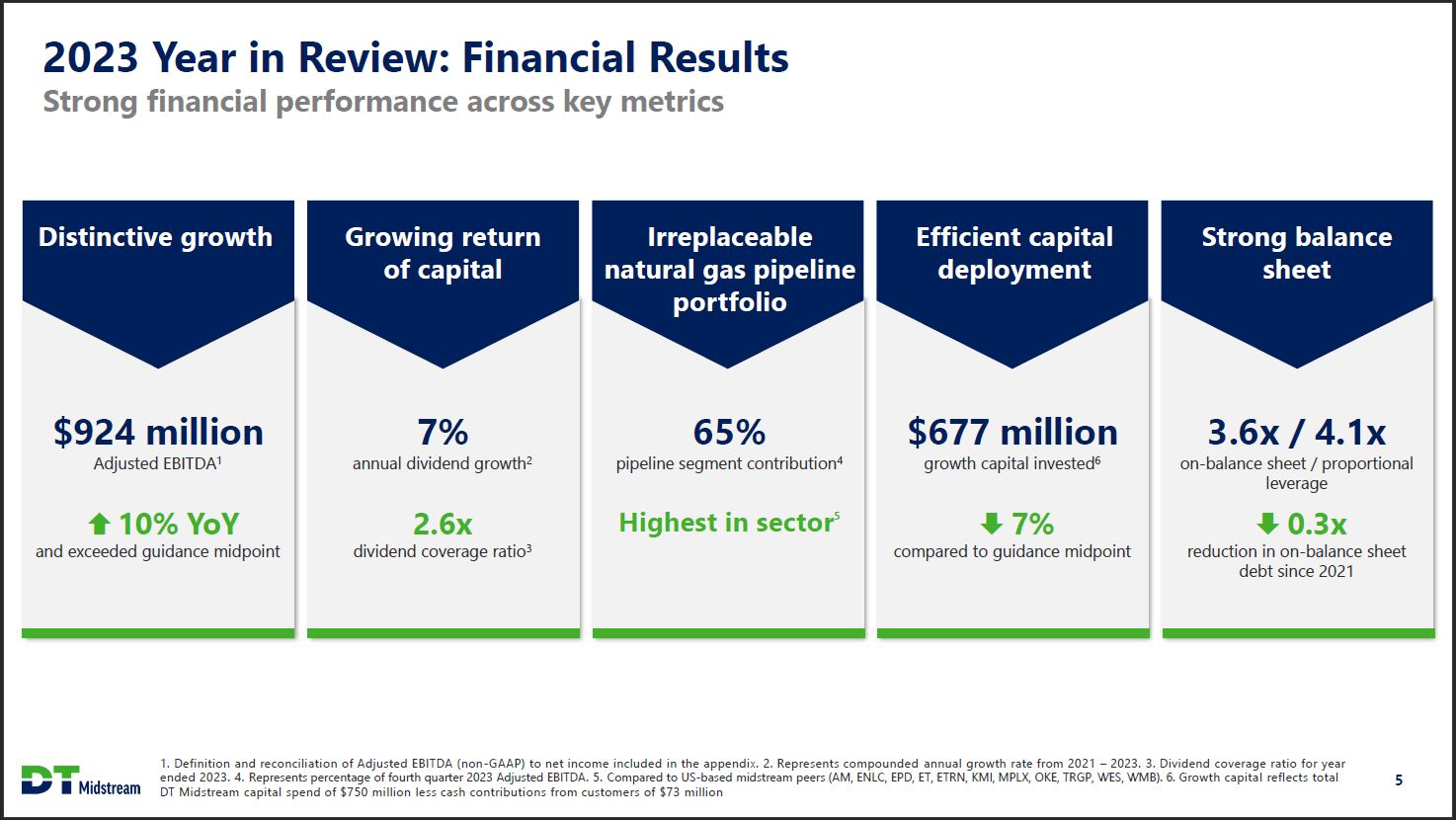 2023 Year in Review Delivering on our commitments and building for the future Delivered strong growth and financial results exceeding guidance Executed growth investments ahead of schedule and on budget Positioned assets to ramp into growing gas demand Advanced energy transition platform DT Midstream 4