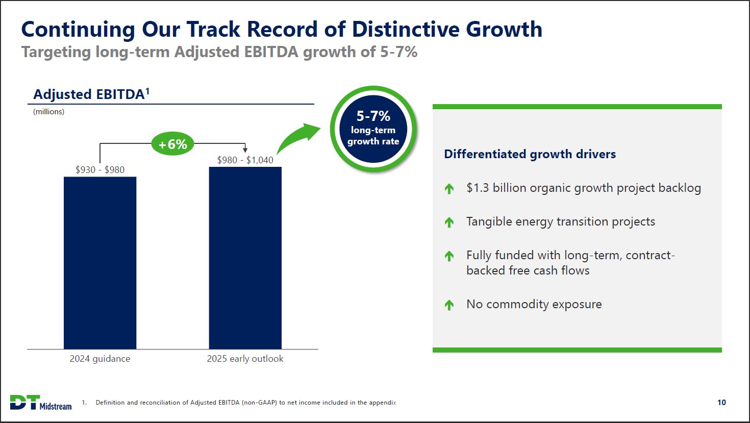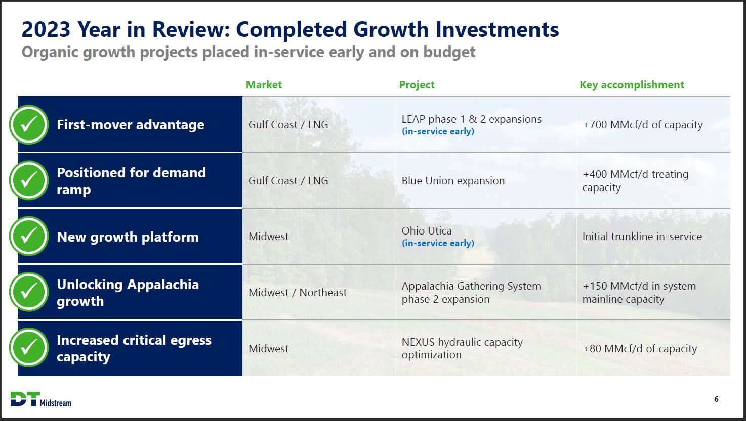 2023 Year in Review: Financial Results Strong financial performance across key metrics Distinctive growth $924 million Adjusted EBITDA1 10% YoY and exceeded guidance midpoint Growing return of capital 7% annual dividend growth2 2.6x dividend coverage ratio3 Irreplaceable natural gas pipeline portfolio 65% pipeline segment contribution4 Highest in sector5 Efficient capital deployment $677 million growth capital invested6 7% compared to guidance midpoint Strong balance sheet 3.6x / 4.1x on-balance sheet / proportional leverage 0.3x reduction in on-balance sheet debt since 2021 DT Midstream 1. Definition and reconciliation of Adjusted EBITDA (non-GAAP) to net income included in the appendix. 2. Represents compounded annual growth rate from 2021 - 2023. 3. Dividend coverage ratio for year ended 2023. 4. Represents percentage of fourth quarter 2023 Adjusted EBITDA. 5. Compared to US-based midstream peers (AM, ENLC, EPD, ET, ETRN, KMI, MPLX, OKE, TRGP, WES, WMB). 6. Growth capital reflects total DT Midstream capital spend of $750 million less cash contributions from customers of $73 million 5