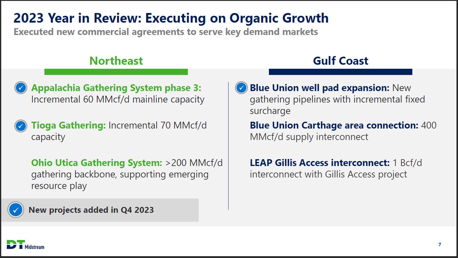 2023 Year in Review: Completed Growth Investments Organic growth projects placed in-service early and on budget Market Project Key accomplishment First-mover advantage Gulf Coast / LNG LEAP phase 1 & 2 expansions (in-service early) +700 MMcf/d of capacity Positioned for demand ramp Gulf Coast / LNG Blue Union expansion +400 MMcf/d treating capacity New growth platform Midwest Ohio Utica (in-service early) Initial trunkline in-service Unlocking Appalachia growth Midwest / Northeast Appalachia Gathering System phase 2 expansion +150 MMcf/d in system mainline capacity Increased critical egress capacity Midwest NEXUS hydraulic capacity optimization +80 MMcf/d of capacity DT Midstream 6