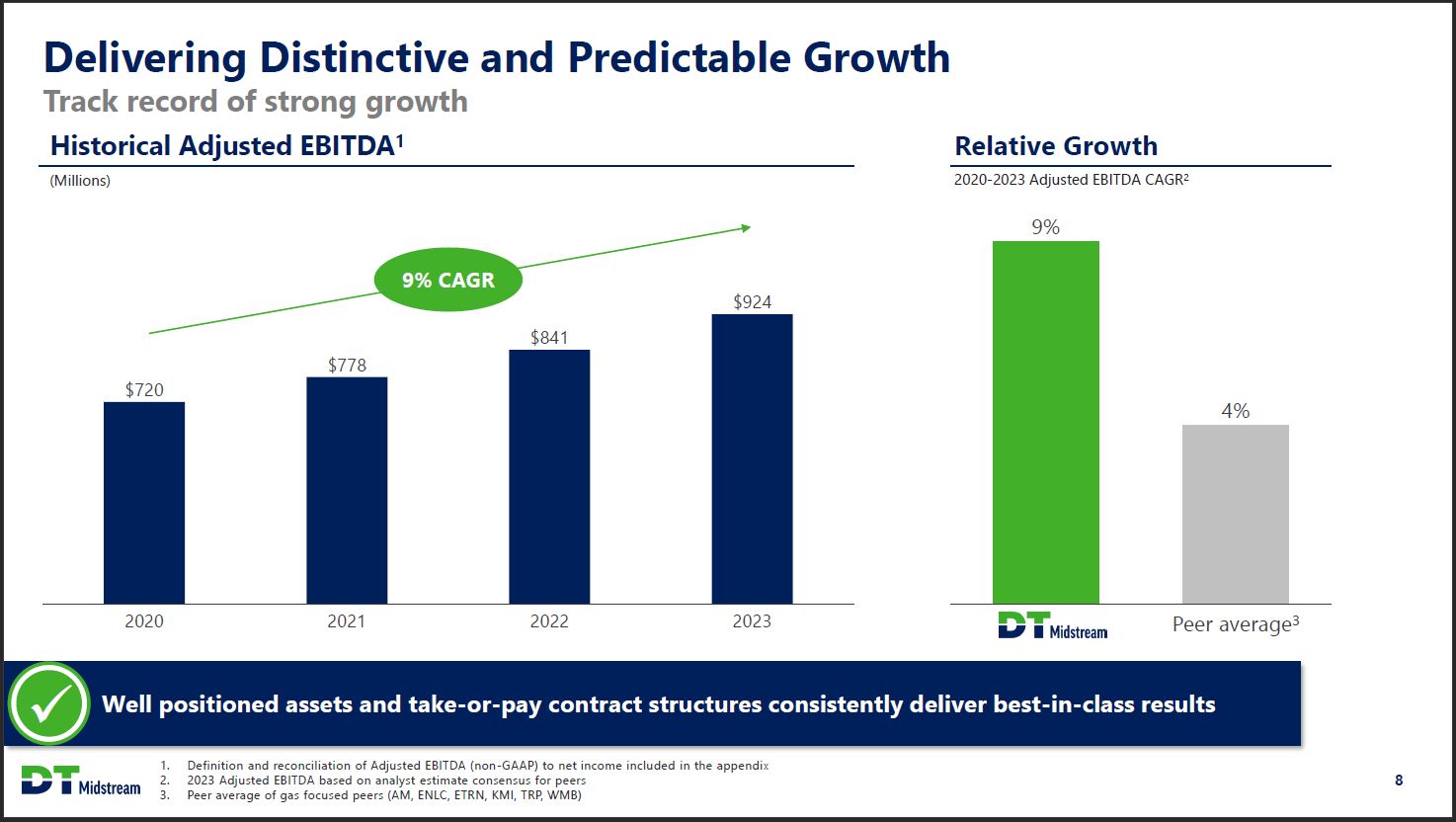 2023 Year in Review: Executing on Organic Growth Executed new commercial agreements to serve key demand markets Northeast Appalachia Gathering System phase 3: Incremental 60 MMcf/d mainline capacity Tioga Gathering: Incremental 70 MMcf/d capacity Ohio Utica Gathering System: >200 MMcf/d gathering backbone, supporting emerging resource play New projects added in Q4 2023 Gulf Coast Blue Union well pad expansion: New gathering pipelines with incremental fixed surcharge Blue Union Carthage area connection: 400 MMcf/d supply interconnect LEAP Gillis Access interconnect: 1 Bcf/d interconnect with Gillis Access project DT Midstream 7