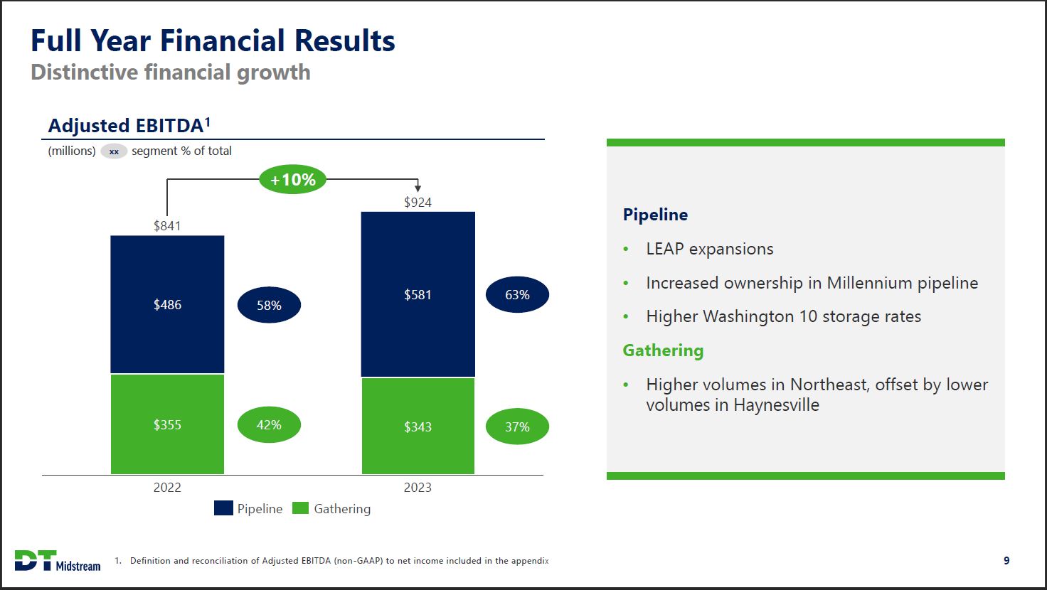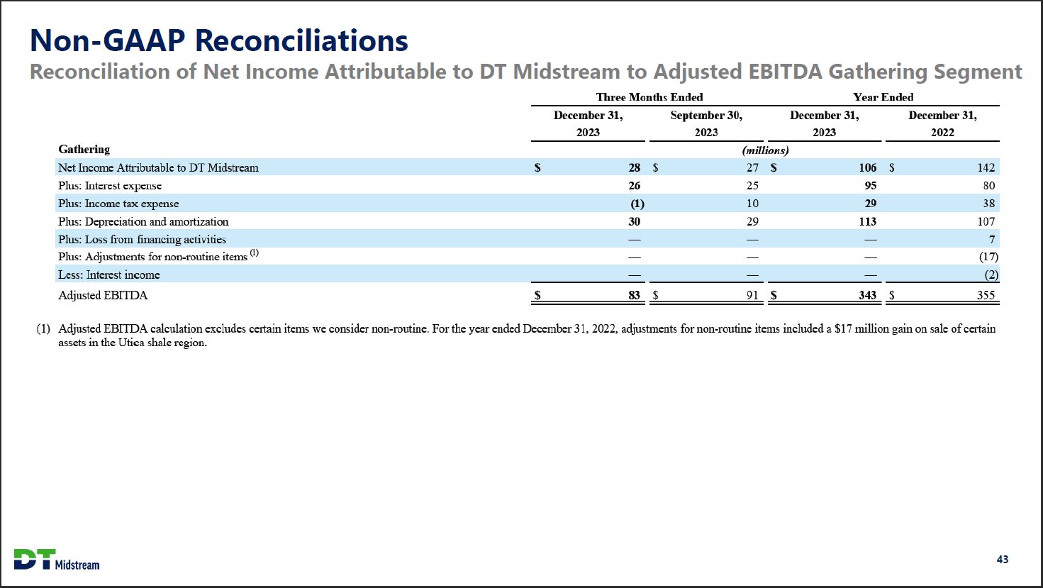 Non-GAAP Reconciliations Reconciliation of Net Income Attributable to DT Midstream to Adjusted EBITDA Pipeline Segment Three Months Ended Year Ended December 31, 2023 September 30, 2023 December 31, 2023 December 31, 2022 Pipeline (millions) Net Income Attributable to DT Midstream $ 93 $ 64 $ 278 $ 228 Plus: Interest expense 13 13 55 57 Plus: Income tax expense 3 23 75 62 Plus: Depreciation and amortization 19 17 69 63 Plus: Loss from financing activities - - - 6 Plus: EBITDA from equity method investees (1) 74 70 286 217 Plus: Adjustments for non-routine items (2) - - - 7 Less: Interest income - - (1) (1) Less: Earnings from equity method investees (45) (41) (177) (150) Less: Depreciation and amortization attributable to noncontrolling interests (1) (1) (4) (3) Adjusted EBITDA $ 156 $ 145 $ 581 $ 486 (1) Includes share of our equity method investees' earnings before interest, taxes, depreciation and amortization, which we refer to as "EBITDA." A reconciliation of earnings from earnings from equity method investees to EBITDA from equity method investees follows: Three Months Ended Year Ended December 31, 2023 September 30, 2023 December 31, 2023 December 31, 2022 (millions) Earnings from equity methods investees $ 45 $ 41 $ 177 $ 150 Plus: Depreciation and amortization attributable to equity method investees 21 20 82 56 Plus: Interest expense attributable to equity method investees 8 9 27 11 EBITDA from equity method investees $ 74 $ 70 $ 286 $ 217 (2) Adjusted EBITDA calculation excludes certain items we consider non-routine. For the year ended December 31, 2022, adjustments for non-routine items included a $17 million gain on sale of certain assets in the Utica shale region, partially offset by an equity method investee goodwill impairment of $7 million. DT Midstream 42