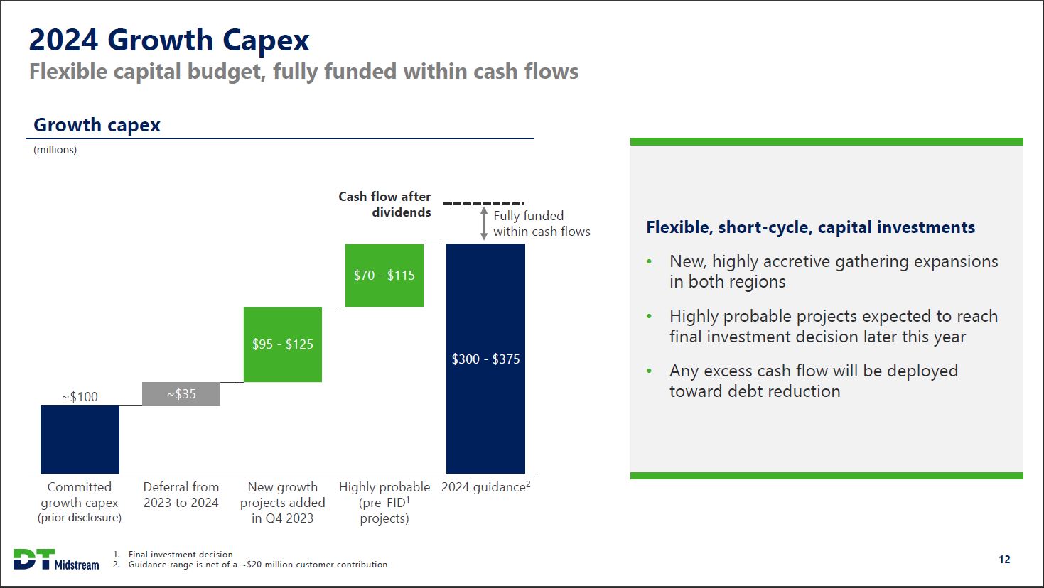 Committed Growth Investment Summary Continue to advance short-cycle growth investments Project Expected in-service dates Pipeline Haynesville LEAP pipeline expansion - phase 2 In-service Haynesville LEAP Gillis Access interconnect Q2 2024 Haynesville LEAP pipeline expansion - phase 3 Q3 2024 Gathering Appalachia Gathering System expansion - phase 2 In-service Haynesville Blue Union expansion In-service Ohio Utica Gathering System - initial development Q1 2024 Haynesville Blue Union Carthage area connection Q2 2024 Appalachia Tioga Gathering expansion (New) Q2 2025 Appalachia Gathering System expansion - phase 3 (New) Q2 2025 Haynesville Blue Union well pad expansion (New) Q2 2025 In-flight project updates LEAP phase 3 is currently ahead of schedule All other growth investments on track and on budget DT Midstream 11