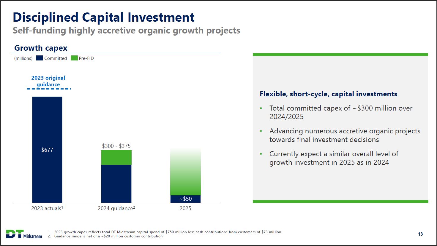 2024 Growth Capex Flexible capital budget, fully funded within cash flows Growth capex (millions) ~$100 Committed growth capex (prior disclosure) ~$35 Deferral from 2023 to 2024 $95 - $125 New growth projects added in Q4 2023 Cash flow after dividends $70 - $115 Highly probable (pre-FID1 projects) Fully funded within cash flows $300 - $375 2024 guidance2 Flexible, short-cycle, capital investments New, highly accretive gathering expansions in both regions Highly probable projects expected to reach final investment decision later this year Any excess cash flow will be deployed toward debt reduction DT Midstream 1. Final investment decision 2. Guidance range is net of a ~$20 million customer contribution 12
