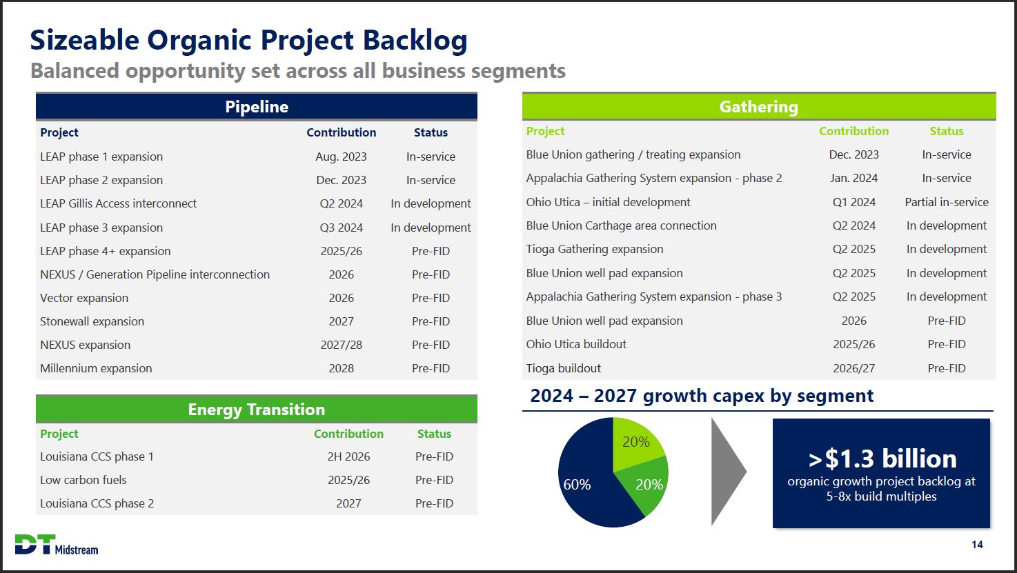 Disciplined Capital Investment Self-funding highly accretive organic growth projects Growth capex (millions) Committed Pre-FID 2023 original guidance $677 2023 actuals1 $300 - $375 2024 guidance2 ~$50 2025 Flexible, short-cycle, capital investments Total committed capex of ~$300 million over 2024/2025 Advancing numerous accretive organic projects towards final investment decisions Currently expect a similar overall level of growth investment in 2025 as in 2024 DT Midstream 1. 2023 growth capex reflects total DT Midstream capital spend of $750 million less cash contributions from customers of $73 million 2. Guidance range is net of a ~$20 million customer contribution 13