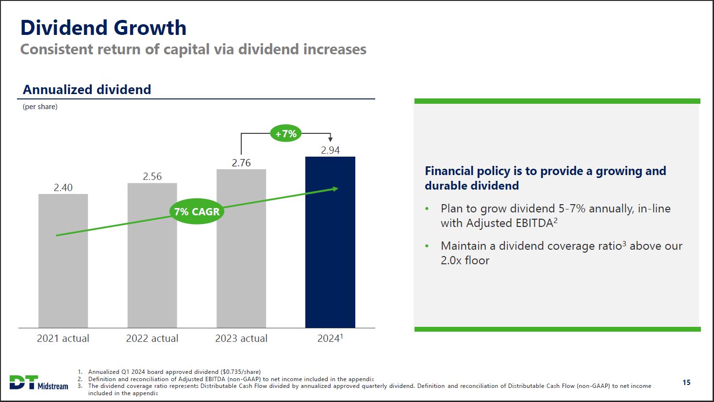 Sizeable Organic Project Backlog Balanced opportunity set across all business segments Pipeline Project Contribution Status LEAP phase 1 expansion Aug. 2023 In-service LEAP phase 2 expansion Dec. 2023 In-service LEAP Gillis Access interconnect Q2 2024 In development LEAP phase 3 expansion Q3 2024 In development LEAP phase 4+ expansion 2025/26 Pre-FID NEXUS / Generation Pipeline interconnection 2026 Pre-FID Vector expansion 2026 Pre-FID Stonewall expansion 2027 Pre-FID NEXUS expansion 2027/28 Pre-FID Millennium expansion 2028 Pre-FID Energy Transition Project Contribution Status Louisiana CCS phase 1 2H 2026 Pre-FID Low carbon fuels 2025/26 Pre-FID Louisiana CCS phase 2 2027 Pre-FID Gathering Project Contribution Status Blue Union gathering / treating expansion Dec. 2023 In-service Appalachia Gathering System expansion - phase 2 Jan. 2024 In-service Ohio Utica - initial development Q1 2024 Partial in-service Blue Union Carthage area connection Q2 2024 In development Tioga Gathering expansion Q2 2025 In development Blue Union well pad expansion Q2 2025 In development Appalachia Gathering System expansion - phase 3 Q2 2025 In development Blue Union well pad expansion 2026 Pre-FID Ohio Utica buildout 2025/26 Pre-FID Tioga buildout 2026/27 Pre-FID 2024 - 2027 growth capex by segment 60% 20% 20% > $1.3 billion organic growth project backlog at 5-8x build multiples DT Midstream 14