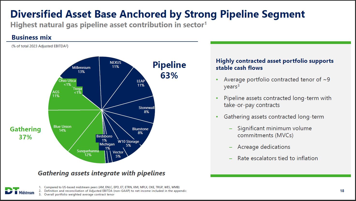 Diversified Asset Base Anchored by Strong Pipeline Segment Highest natural gas pipeline asset contribution in sector1 Business mix (% of total 2023 Adjusted EBITDA2) Gathering 37% Ohio Utica <1% Tioga <1% AGS 11% Blue Union 14% Susquehanna 12% Pipeline 63% Millennium 13% NEXUS 11% LEAP 11% Stonewall 8% Bluestone 8% W10 Storage 5% Vector 5% Birdsboro 1% Michigan 1% Gathering assets integrate with pipelines Highly contracted asset portfolio supports stable cash flows Average portfolio contracted tenor of ~9 years3 Pipeline assets contracted long-term with take-or-pay contracts Gathering assets contracted long-term Significant minimum volume commitments (MVCs) Acreage dedications Rate escalators tied to inflation DT Midstream 1. Compared to US-based midstream peers (AM, ENLC, EPD, ET, ETRN, KMI, MPLX, OKE, TRGP, WES, WMB) 2. Definition and reconciliation of Adjusted EBITDA (non-GAAP) to net income included in the appendix 3. Overall portfolio weighted average contract tenor 18