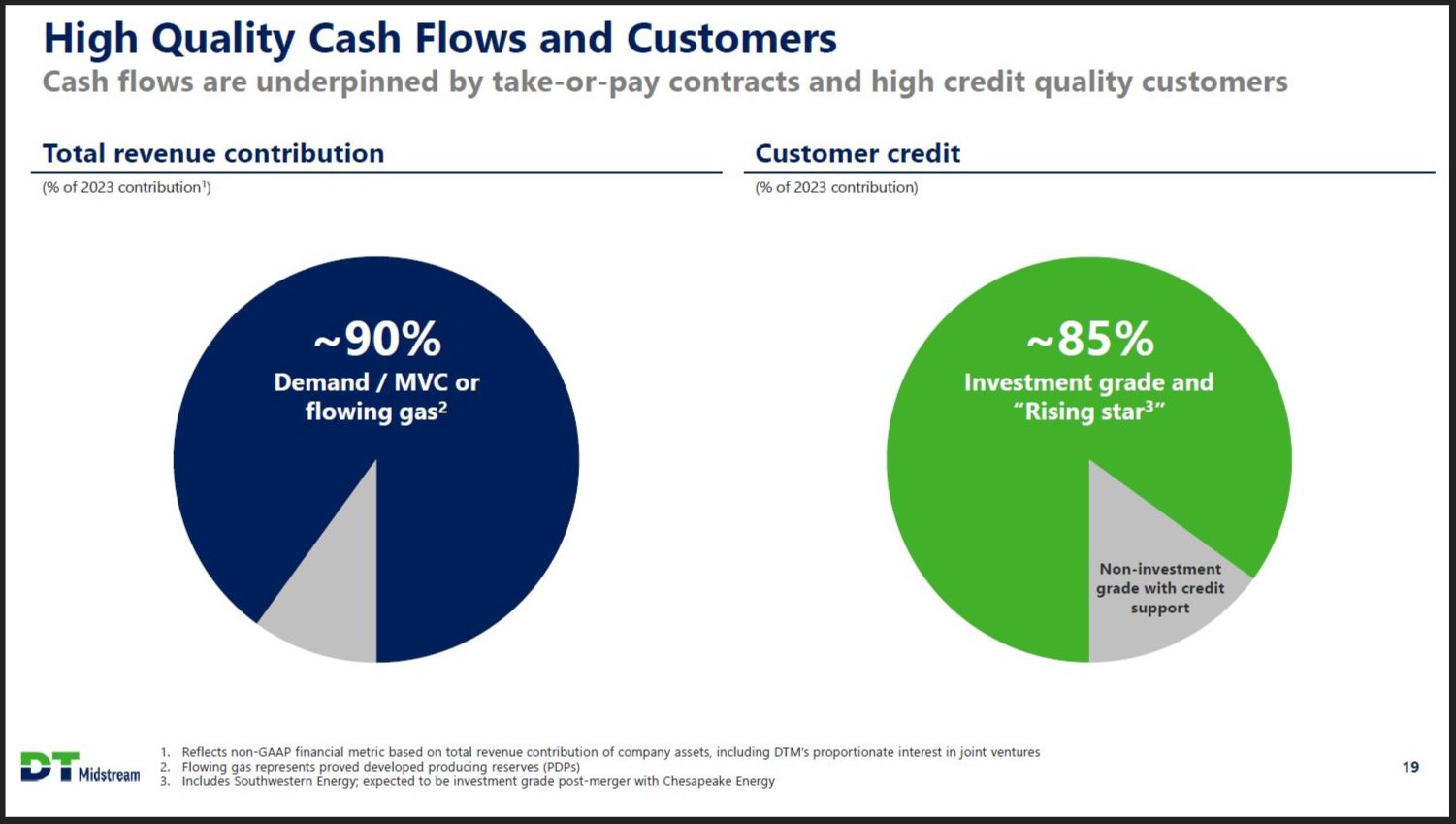 High Quality Cash Flows and Customers Cash flows are underpinned by take-or-pay contracts and high credit quality customers Total revenue contribution (% of 2023 contribution1) ~90% demand / MVC or flowing gas2 Customer credit (% of 2023 contribution) ~85% Investment grade and "Rising star3" Non-investment grade with credit support DT Midstream 1. Reflects non-GAAP financial metric based on total revenue contribution of company assets, including DTM's proportionate interest in joint ventures 2. Flowing gas represents proved developed producing reserves (PDPs) 3. Includes Southwestern Energy; expected to be investment grade post merger with Chesapeake Energy 19