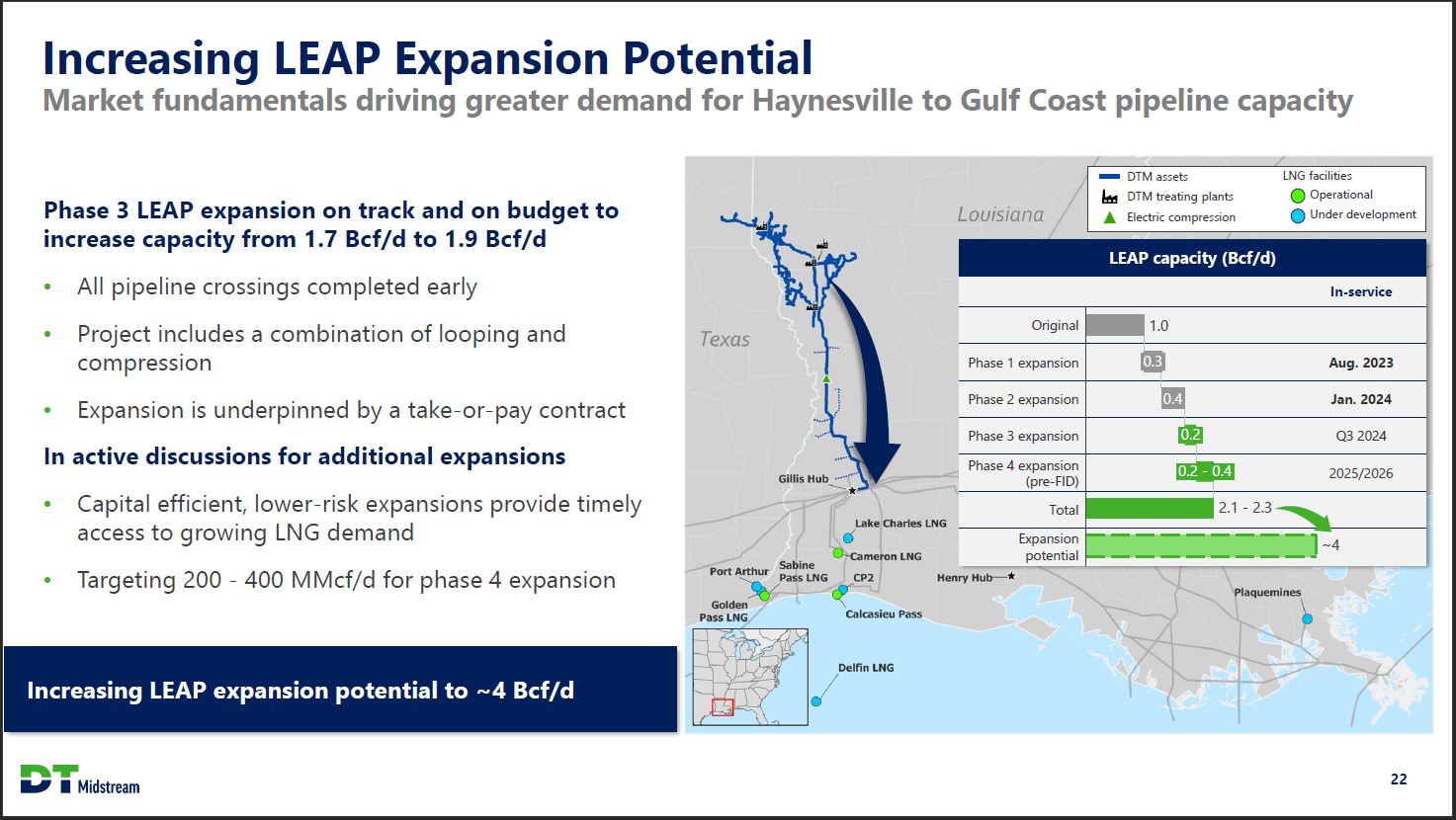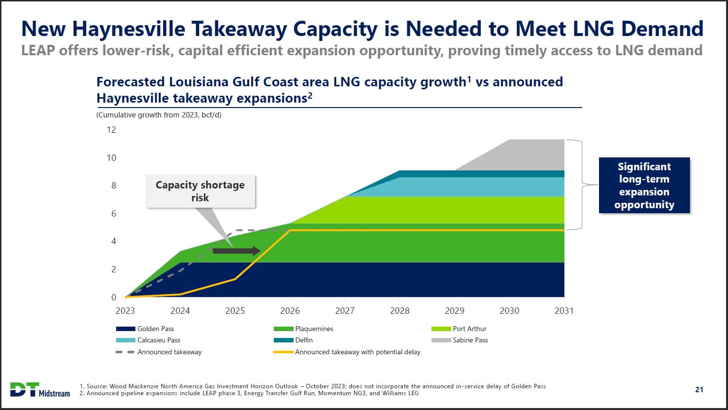 New Haynesville Takeaway Capacity is Needed to Meet LNG Demand LEAP offers lower-risk, capital efficient expansion opportunity, proving timely access to LNG demand Forecasted Louisiana Gulf Coast area LNG capacity growth1 vs announced Haynesville takeaway expansions2 (Cumulative growth from 2023, bcf/d) Capacity shortage risk 12 10 8 6 4 2 0 2023 2024 2025 2026 2027 2028 2029 2030 2031 Significant long-term expansion opportunity Golden Pass Calcasieu Pass Announced takeaway Plaquemines Delfin Announced takeaway with potential delay Port Arthur Sabine Pass DT Midstream 1. Source: Wood Mackenzie North America Gas Investment Horizon Outlook - October 2023; does not incorporate the announced in-service delay of Golden Pass 2. Announced pipeline expansions include LEAP phase 3, Energy Transfer Gulf Run, Momentum NG3, and Williams LEG 21