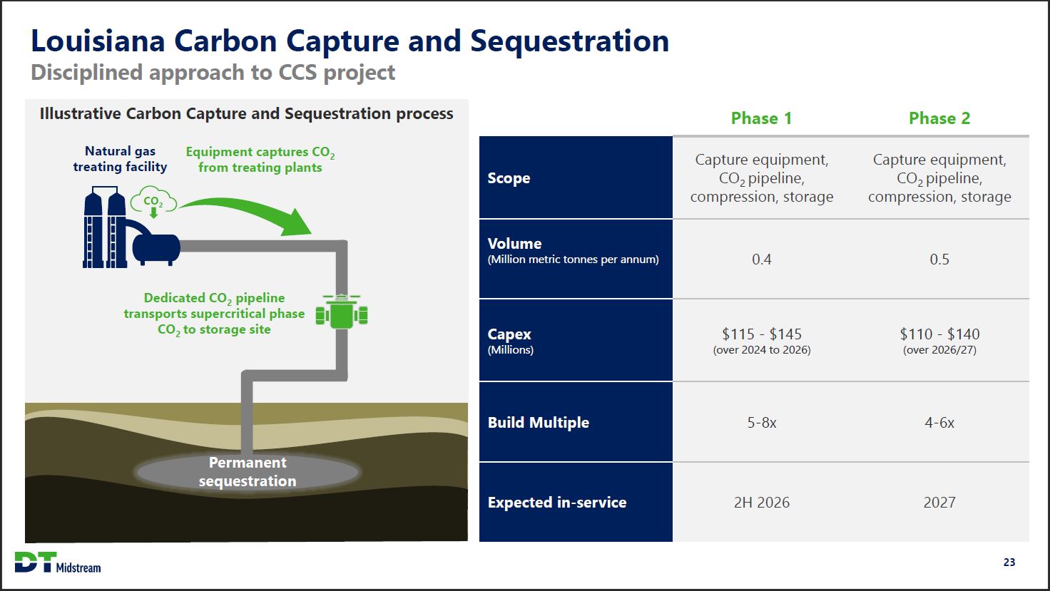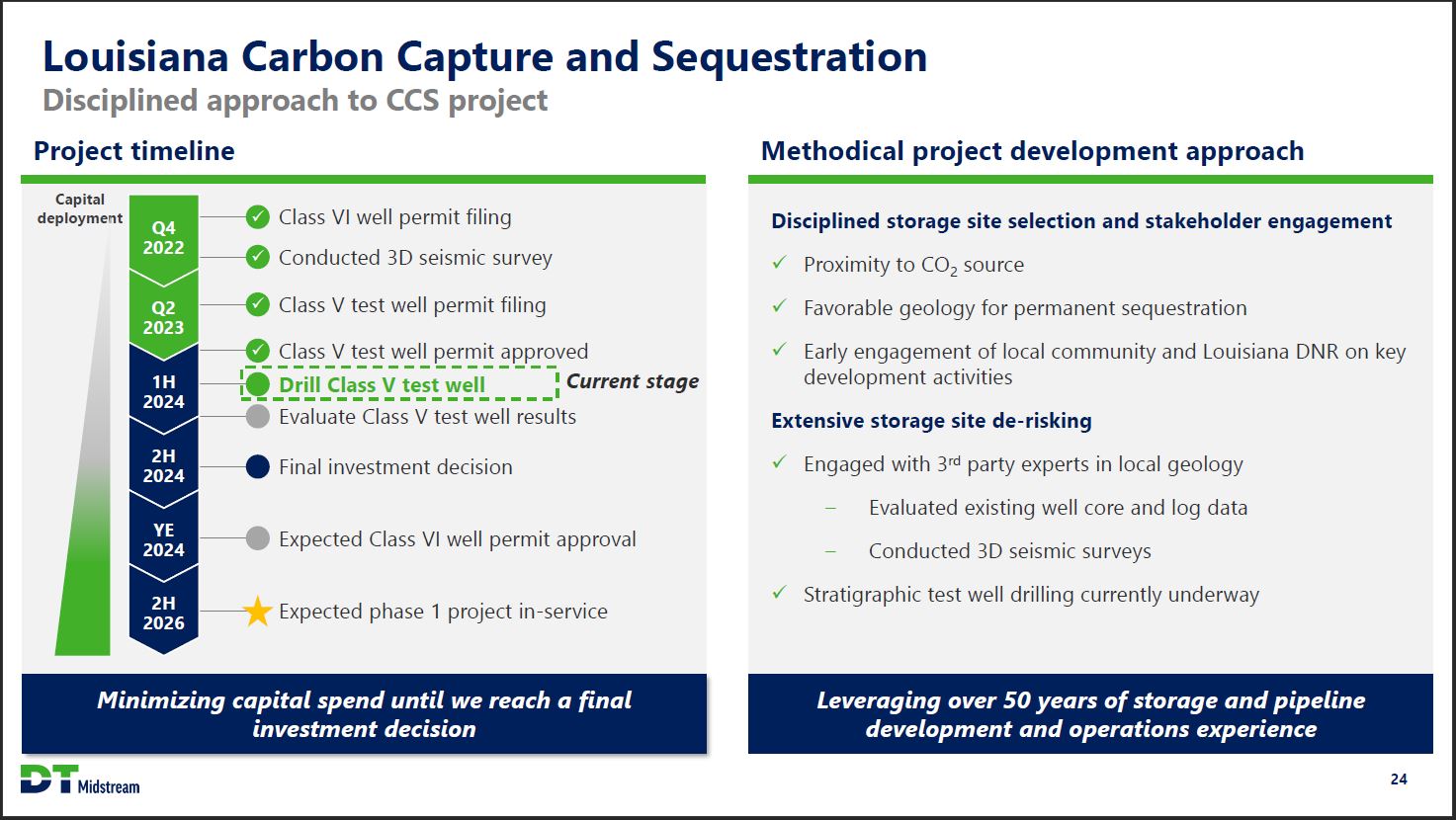 Louisiana Carbon Capture and Sequestration Disciplined approach to CCS project Project timeline Capital deployment Q4 2022 Class VI well permit filing Conducted 3D seismic survey Q2 2023 Class V test well permit filing 1H 2024 Class V test well permit approved Drill Class V test well Current stage Evaluate Class V test well results 2H 2024 Final investment decision YE 2024 Expected Class VI well permit approval 2H 2026 Expected phase 1 project in-service Minimizing capital spend until we reach a final investment decision Methodical project development approach Disciplined storage site selection and stakeholder engagement Proximity to CO2 source Favorable geology for permanent sequestration Early engagement of local community and Louisiana DNR on key development activities Extensive storage site de-risking Engaged with 3rd party experts in local geology Evaluated existing well core and log data Conducted 3D seismic surveys Stratigraphic test well drilling currently underway Leveraging over 50 years of storage and pipeline development and operations experience DT Midstream 24