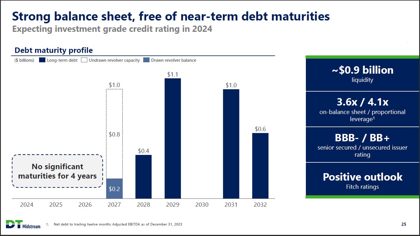 Strong balance sheet, free of near-term debt maturities Expecting investment grade credit rating in 2024 Debt maturity profile ($ billions) Long-term debt Undrawn revolver capacity Drawn revolver balance No significant maturities for 4 years 2024 2025 2026 $1.0 $0.8 $0.2 2027 $0.4 2028 $1.1 2029 2030 $1.0 2031 $0.6 2032 ~$0.9 billion liquidity 3.6x / 4.1x on-balance sheet / proportional leverage1 BBB- / BB+ senior secured / unsecured issuer rating Positive outlook Fitch ratings DT Midstream 1. Net debt to trailing twelve months Adjusted EBITDA as of December 31, 2023 25