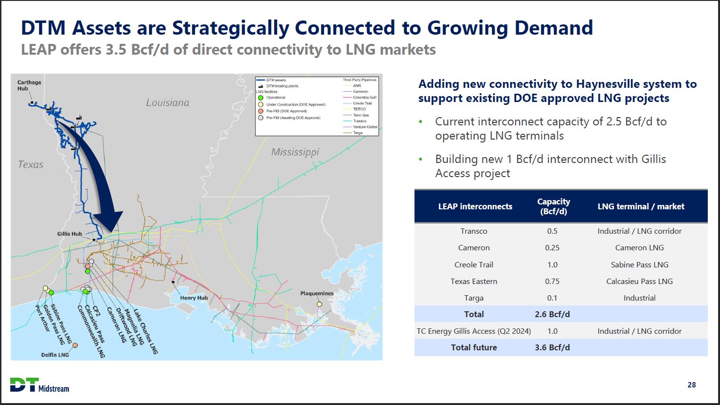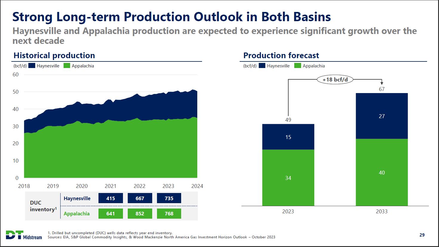 DTM Assets are Strategically Connected to Growing Demand LEAP offers 3.5 Bcf/d of direct connectivity to LNG markets Carthage Hub Louisiana DTM assets Third Party Pipelines DTM treating plants ANR LNG facilities Cameron Operational Columbia Gulf Under Construction (DOE Approved Creole Trail Pre-FID (DOE Approved) TETCO Pre-FID (Awaiting DOE Approval) Tenn Gas Transco Venture Global Targa Texas Mississippi Gillis Hub Port Arthur Golden Pass LNG Sabine Pass LNG Commonwealth LNG Calcasieu Pass CP2 Cameron LNG Driftwood LNG Magnolia LNG Lake Charles LNG Henry Hub Plaquemines Delfin LNG Adding new connectivity to Haynesville system to support existing DOE approved LNG projects Current interconnect capacity of 2.5 Bcf/d to operating LNG terminals Building new 1 Bcf/d interconnect with Gillis Access project LEAP interconnects Capacity (Bcf/d) LNG terminal / market Transco 0.5 Industrial / LNG corridor Cameron 0.25 Cameron LNG Creole Trail 1.0 Sabine Pass LNG Texas Eastern 0.75 Calcasieu Pass LNG Targa 0.1 Industrial Total 2.6 Bcf/d TC Energy Gillis Access (Q2 2024) 1.0 Industrial / LNG corridor Total future 3.6 Bcf/d DT Midstream 28