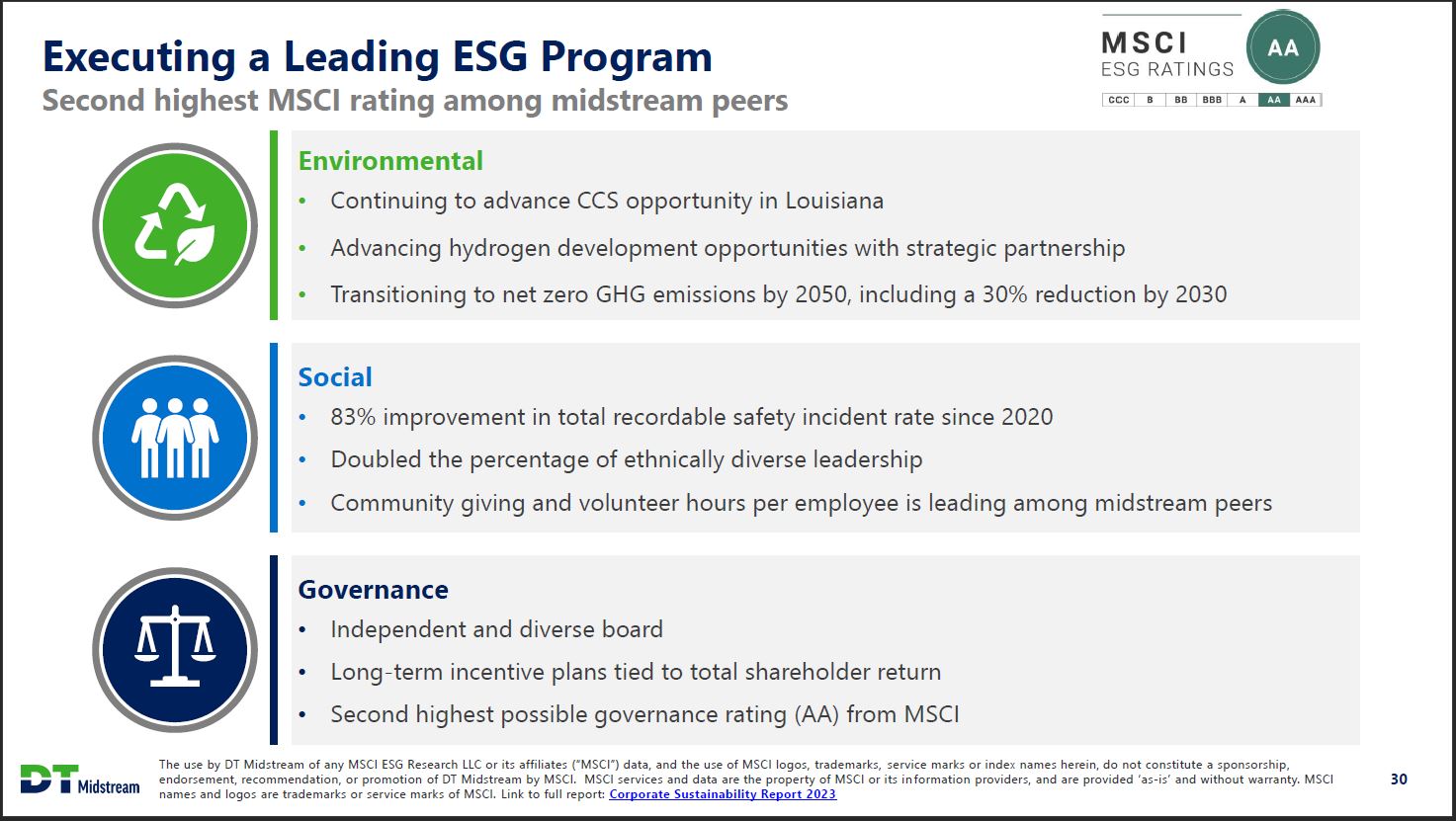 Executing a Leading ESG Program MSCI ESG RATINGS AA CCC B BB BBB A AA AAA Second highest MSCI rating among midstream peers Environmental Continuing to advance CCS opportunity in Louisiana Advancing hydrogen development opportunities with strategic partnership Transitioning to net zero GHG emissions by 2050, including a 30% reduction by 2030 Social 83% improvement in total recordable safety incident rate since 2020 Doubled the percentage of ethnically diverse leadership Community giving and volunteer hours per employee is leading among midstream peers Governance Independent and diverse board Long-term incentive plans tied to total shareholder return Second highest possible governance rating (AA) from MSCI DT Midstream The use by DT Midstream of any MSCI ESG Research LLC or its affiliates ("MSCI") data, and the use of MSCI logos, trademarks, service marks or index names herein, do not constitute a sponsorship, endorsement, recommendation, or promotion of DT Midstream by MSCI. MSCI services and data are the property of MSCI or its information providers, and are provided 'as-is' and without warranty. MSCI names and logos are trademarks or service marks of MSCI. Link to full report: Corporate Sustainability Report 2023 30