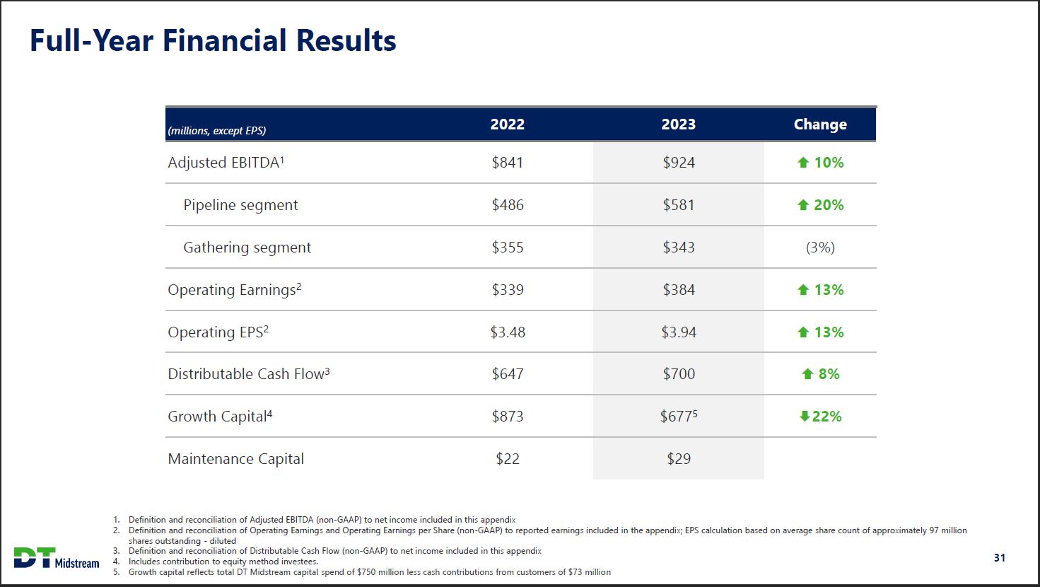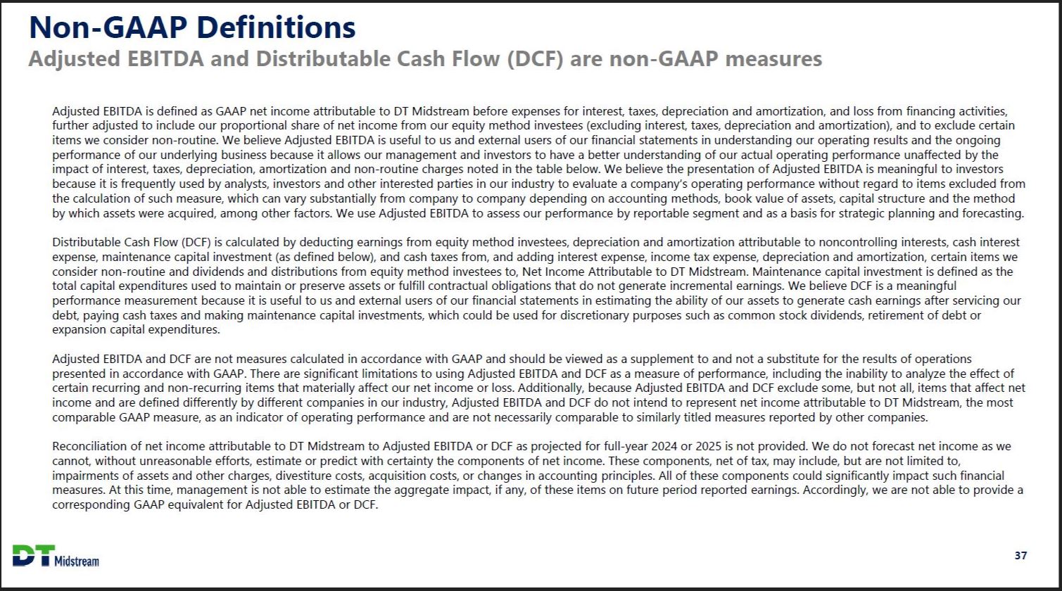 Non-GAAP Definitions Adjusted EBITDA and Distributable Cash Flow (DCF) are non-GAAP measures Adjusted EBITDA is defined as GAAP net income attributable to DT Midstream before expenses for interest, taxes, depreciation and amortization, and loss from financing activities, further adjusted to include our proportional share of net income from our equity method investees (excluding interest, taxes, depreciation and amortization), and to exclude certain items we consider non-routine. We believe Adjusted EBITDA is useful to us and external users of our financial statements in understanding our operating results and the ongoing performance of our underlying business because it allows our management and investors to have a better understanding of our actual operating performance unaffected by the impact of interest, taxes, depreciation, amortization and non-routine charges noted in the table below. We believe the presentation of Adjusted EBITDA is meaningful to investors because it is frequently used by analysts, investors and other interested parties in our industry to evaluate a company's operating performance without regard to items excluded from the calculation of such measure, which can vary substantially from company to company depending on accounting methods, book value of assets, capital structure and the method by which assets were acquired, among other factors. We use Adjusted EBITDA to assess our performance by reportable segment and as a basis for strategic planning and forecasting. Distributable Cash Flow (DCF) is calculated by deducting earnings from equity method investees, depreciation and amortization attributable to noncontrolling interests, cash interest expense, maintenance capital investment (as defined below), and cash taxes from, and adding interest expense, income tax expense, depreciation and amortization, certain items we consider non-routine and dividends and distributions from equity method investees to, Net Income Attributable to DT Midstream. Maintenance capital investment is defined as the total capital expenditures used to maintain or preserve assets or fulfill contractual obligations that do not generate incremental earnings. We believe DCF is a meaningful performance measurement because it is useful to us and external users of our financial statements in estimating the ability of our assets to generate cash earnings after servicing our debt, paying cash taxes and making maintenance capital investments, which could be used for discretionary purposes such as common stock dividends, retirement of debt or expansion capital expenditures. Adjusted EBITDA and DCF are not measures calculated in accordance with GAAP and should be viewed as a supplement to and not a substitute for the results of operations presented in accordance with GAAP. There are significant limitations to using Adjusted EBITDA and DCF as a measure of performance, including the inability to analyze the effect of certain recurring and non-recurring items that materially affect our net income or loss. Additionally, because Adjusted EBITDA and DCF exclude some, but not all, items that affect net income and are defined differently by different companies in our industry, Adjusted EBITDA and DCF do not intend to represent net income attributable to DT Midstream, the most comparable GAAP measure, as an indicator of operating performance and are not necessarily comparable to similarly titled measures reported by other companies. Reconciliation of net income attributable to DT Midstream to Adjusted EBITDA or DCF as projected for full-year 2023 is not provided. We do not forecast net income as we cannot, without unreasonable efforts, estimate or predict with certainty the components of net income. These components, net of tax, may include, but are not limited to, impairments of assets and other charges, divestiture costs, acquisition costs, or changes in accounting principles. All of these components could significantly impact such financial measures. At this time, management is not able to estimate the aggregate impact, if any, of these items on future period reported earnings. Accordingly, we are not able to provide a corresponding GAAP equivalent for Adjusted EBITDA or DCF. DT Midstream 37