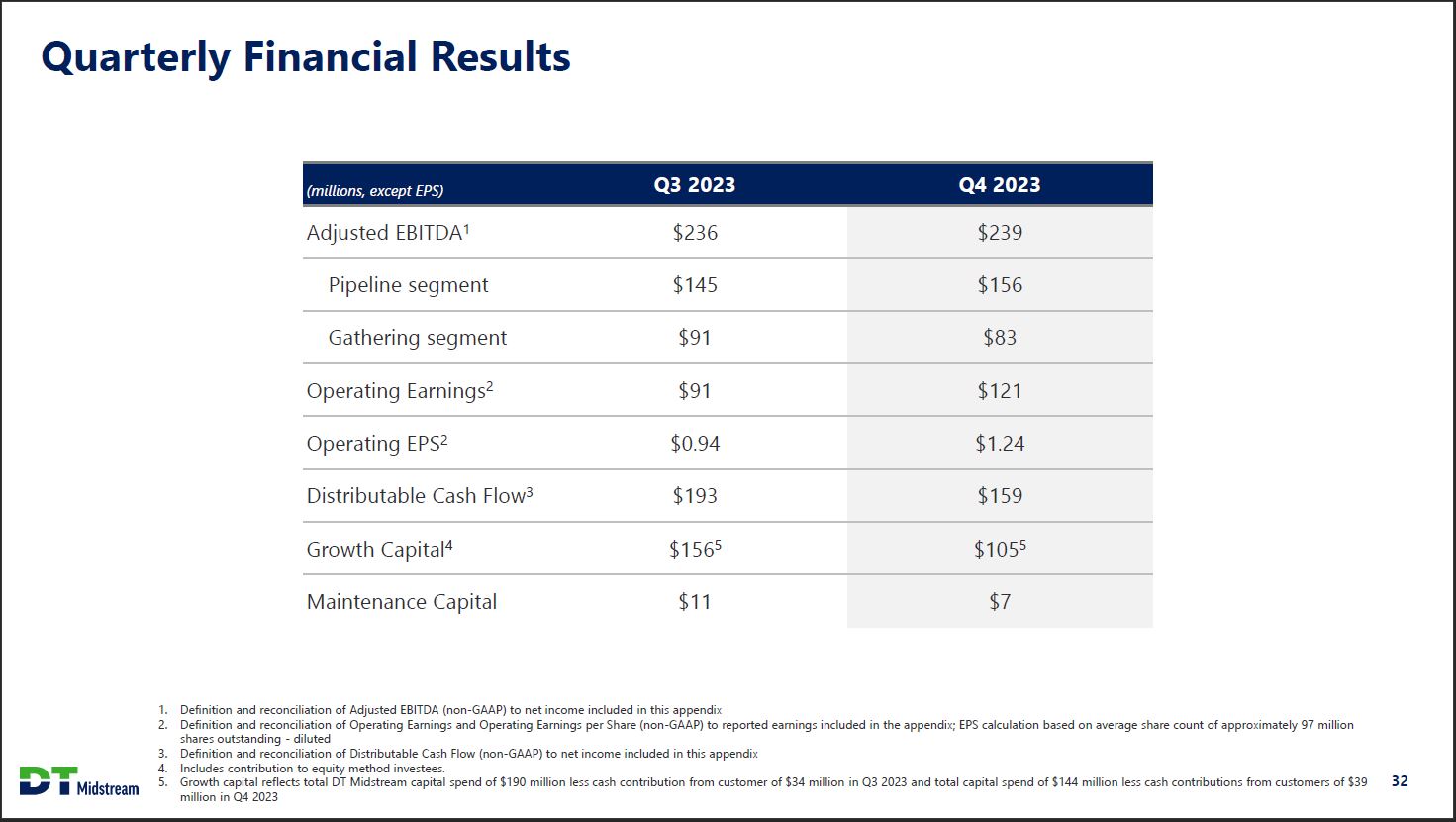 Full-Year Financial Results (millions, except EPS) 2022 2023 Change Adjusted EBITDA1 $841 $924 10% Pipeline segment $486 $581 20% Gathering segment $355 $343 (3%) Operating Earnings2 $339 $384 13% Operating EPS2 $3.48 $3.94 13% Distributable Cash Flow3 $647 $700 8% Growth Capital4 $873 $6775 22% Maintenance Capital $22 $29 DT Midstream 1. Definition and reconciliation of Adjusted EBITDA (non-GAAP) to net income included in this appendix 2. Definition and reconciliation of Operating Earnings and Operating Earnings per Share (non-GAAP) to reported earnings included in the appendix; EPS calculation based on average share count of approximately 97 million shares outstanding - diluted 3. Definition and reconciliation of Distributable Cash Flow (non-GAAP) to net income included in this appendix 4. Includes contribution to equity method investees. 5. Growth capital reflects total DT Midstream capital spend of $750 million less cash contributions from customers of $73 million 31