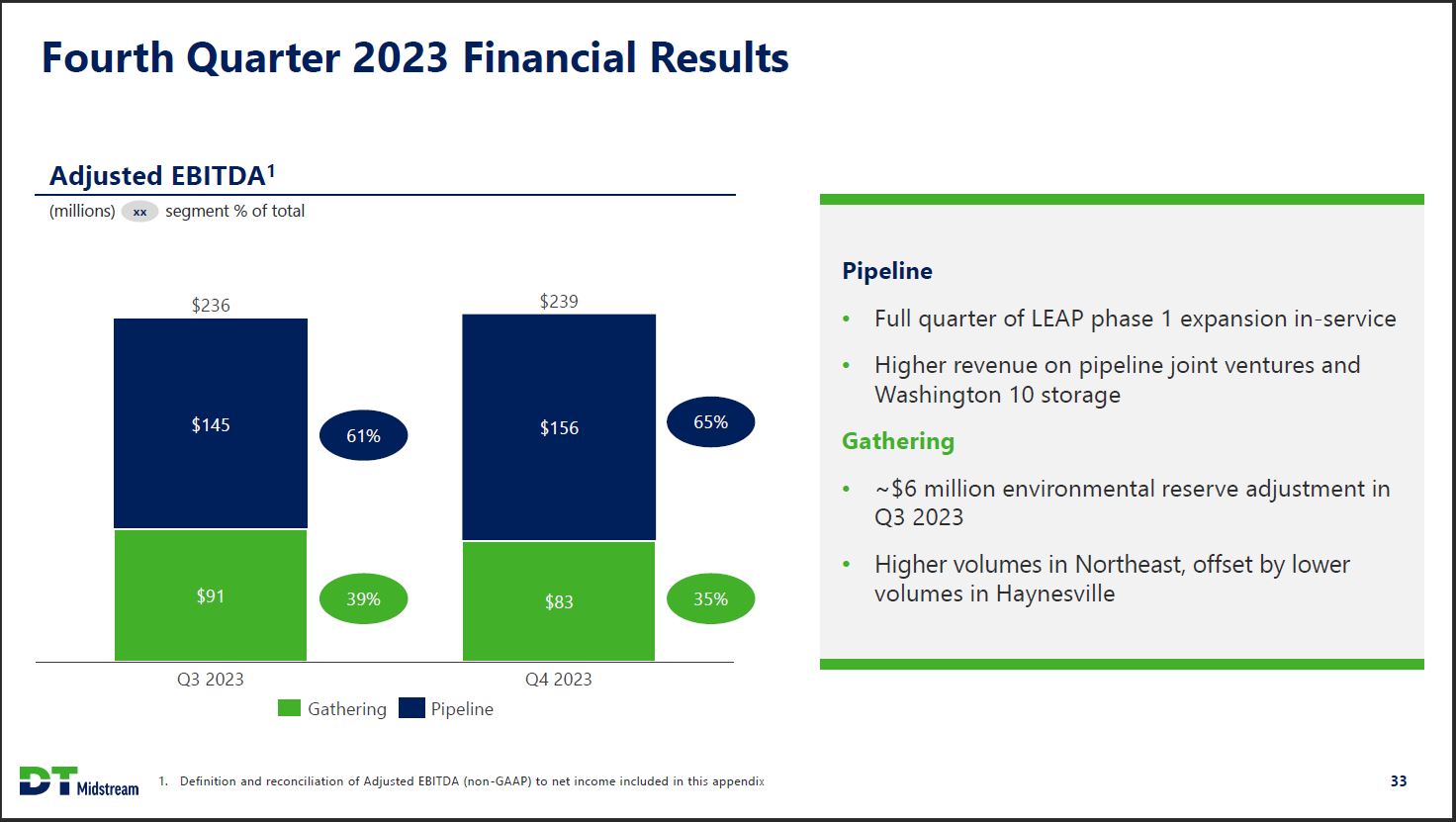 Quarterly Financial Results (millions, except EPS) Q3 2023 Q4 2023 Adjusted EBITDA1 $236 $239 Pipeline segment $145 $156 Gathering segment $91 $83 Operating Earnings2 $91 $121 Operating EPS2 $0.94 $1.24 Distributable Cash Flow3 $193 $159 Growth Capital4 $1565 $1055 Maintenance Capital $11 $7 DT Midstream 1. Definition and reconciliation of Adjusted EBITDA (non-GAAP) to net income included in this appendix 2. Definition and reconciliation of Operating Earnings and Operating Earnings per Share (non-GAAP) to reported earnings included in the appendix; EPS calculation based on average share count of approximately 97 million shares outstanding - diluted 3. Definition and reconciliation of Distributable Cash Flow (non-GAAP) to net income included in this appendix 4. Includes contribution to equity method investees. 5. Growth capital reflects total DT Midstream capital spend of $190 million less cash contribution from customer of $34 million in Q3 2023 and total capital spend of $144 million less cash contributions from customers of $39 million in Q4 2023 32