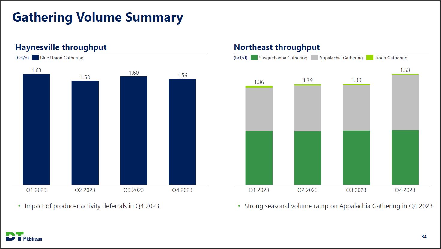 Fourth Quarter 2023 Financial Results Adjusted EBITDA1 (millions) xx segment % of total $236 $145 61% $91 39% Q3 2023 $239 $156 65% $83 35% Q4 2023 Gathering Pipeline Pipeline Full quarter of LEAP phase 1 expansion in-service Higher revenue on pipeline joint ventures and Washington 10 storage Gathering ~$6 million environmental reserve adjustment in Q3 2023 Higher volumes in Northeast, offset by lower volumes in Haynesville DT Midstream 1. Definition and reconciliation of Adjusted EBITDA (non-GAAP) to net income included in this appendix 33