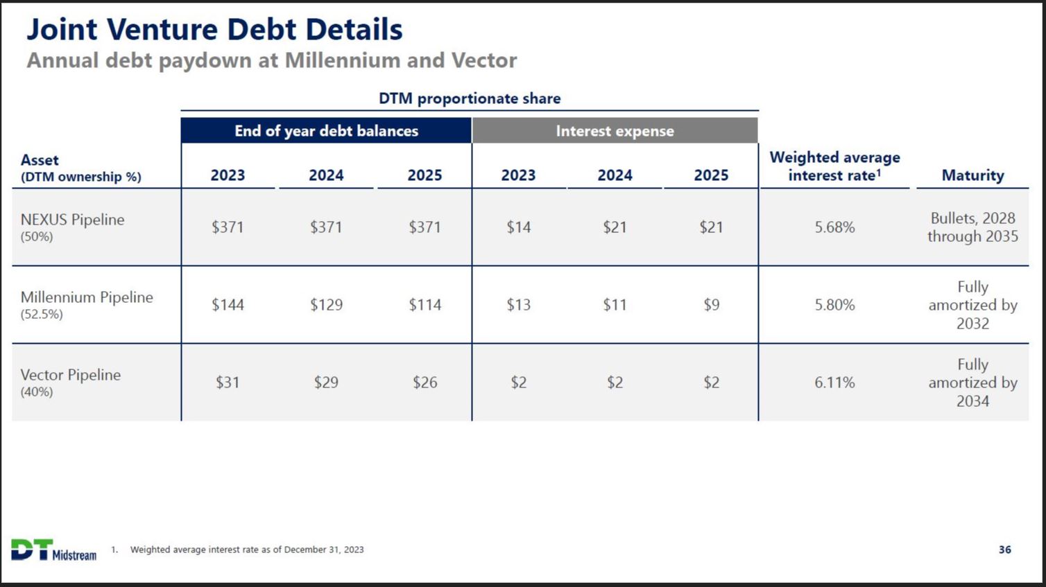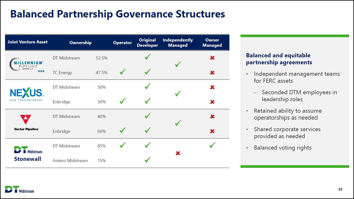 Balanced Partnership Governance Structures Joint Venture Asset Ownership Operator Original Developer Independently Managed Owner Managed MILLENNIUM PIPELINE COMPANY, L.L.C. NEXUS SM GAS TRANSMISSION Vector Pipeline DT Midstream Stonewall DT Midstream 52.5% TC Energy 47.5% DT Midstream 50% Enbridge 50% DT Midstream 40% Enbridge 60% DT Midstream 85% Antero Midstream 15% Balanced and equitable partnership agreements Independent management teams for FERC assets Seconded DTM employees in leadership roles Retained ability to assume operatorships as needed Shared corporate services provided as needed Balanced voting rights DT Midstream 35