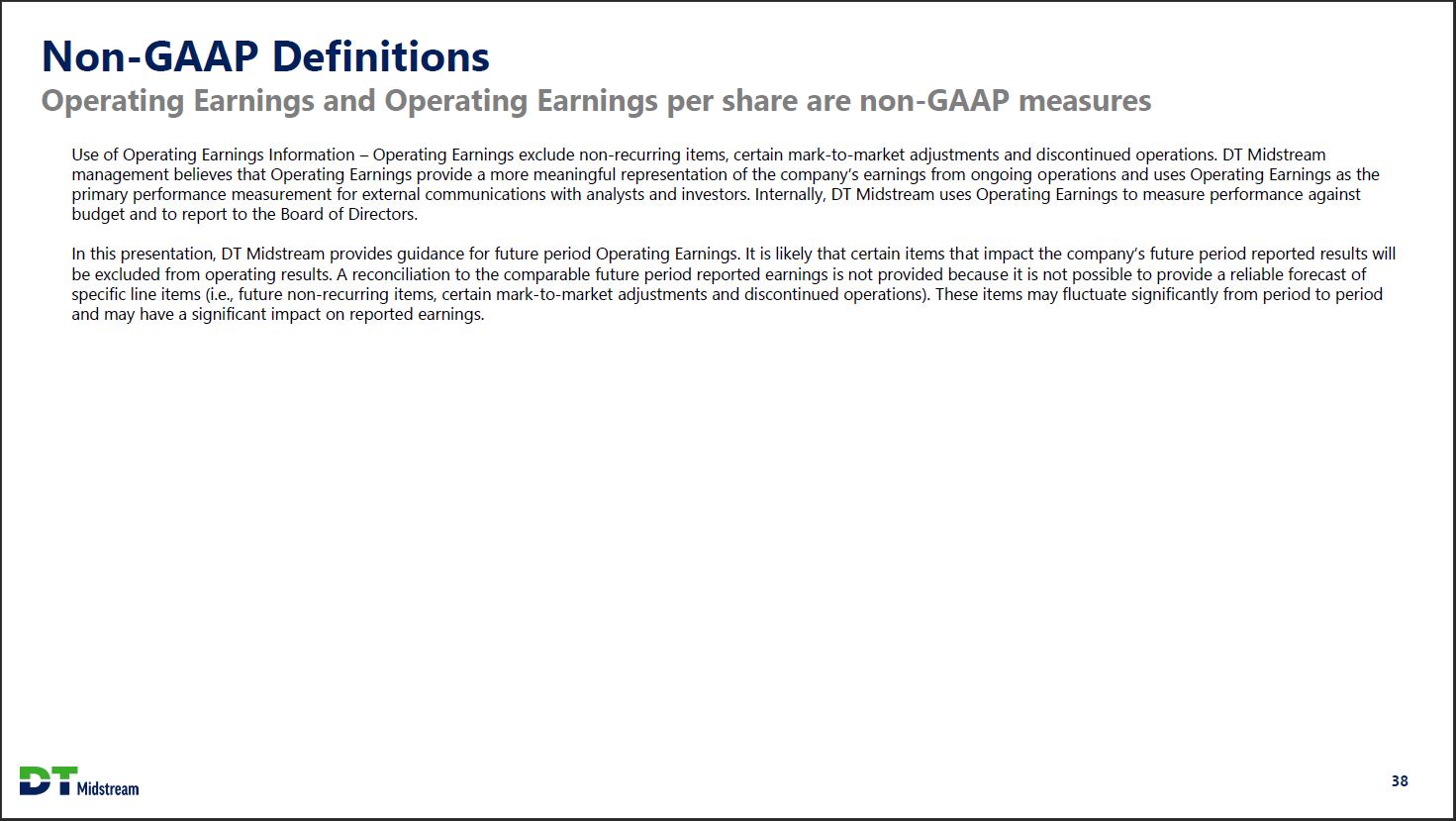 Non-GAAP Definitions Operating Earnings and Operating Earnings per share are non-GAAP measures Use of Operating Earnings Information - Operating Earnings exclude non-recurring items, certain mark-to-market adjustments and discontinued operations. DT Midstream management believes that Operating Earnings provide a more meaningful representation of the company's earnings from ongoing operations and uses Operating Earnings as the primary performance measurement for external communications with analysts and investors. Internally, DT Midstream uses Operating Earnings to measure performance against budget and to report to the Board of Directors. In this presentation, DT Midstream provides guidance for future period Operating Earnings. It is likely that certain items that impact the company's future period reported results will be excluded from operating results. A reconciliation to the comparable future period reported earnings is not provided because it is not possible to provide a reliable forecast of specific line items (i.e., future non-recurring items, certain mark-to-market adjustments and discontinued operations). These items may fluctuate significantly from period to period and may have a significant impact on reported earnings. DT Midstream 38