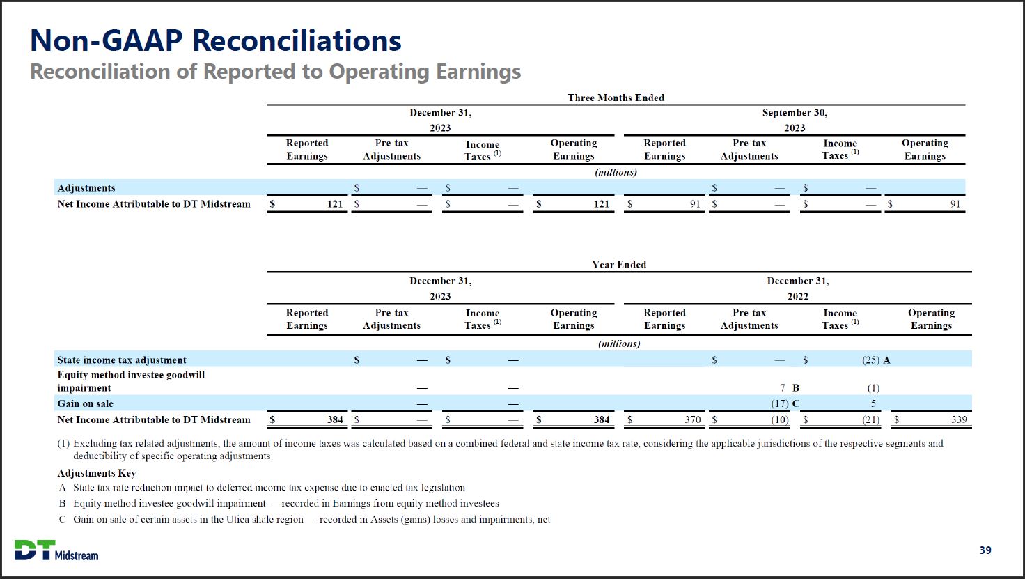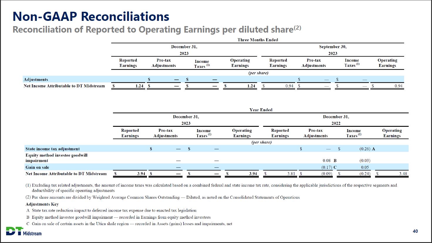 Non-GAAP Reconciliations Reconciliation of Reported to Operating Earnings Three Months Ended December 31, 2023 September 30,2023 Reported Earnings Pre-tax Adjustments Income Taxes (1) Operating Earnings Reported Earnings Pre-tax Adjustments Income Taxes (1) Operating Earnings (millions) Adjustments $ - $ - $ - $ - Net Income Attributable to DT Midstream $ 121 $ - $ - $ 121 $ 91 $ - $ - $ 91 Year Ended December 31, 2023 December 31, 2022 Reported Earnings Pre-tax Adjustments Income Taxes (1) Operating Earnings Reported Earnings Pre-tax Adjustments Income Taxes (1) Operating Earnings (millions) State income tax adjustment $ - $ - $ - $ (25) A Equity method investee goodwill impairment - - 7 B (1) Gain on sale - - (17) C 5 Net Income Attributes to DT Midstream $ 384 $ - $ - $ 384 $ 370 $ (10) $ (21) $ 339 (1) Excluding tax related adjustments, the amount of income taxes was calculated based on a combined federal and state income tax rate, considering the applicable jurisdictions of the respective segments and deductibility of specific operating adjustments Adjustments Key A State tax rate reduction impact to deferred income tax expense due to enacted tax legislation B Equity method investee goodwill impairment - recorded in Earnings from equity method investees C Gain on sale of certain assets in the Utica shale region - recorded in Assets (gains) losses and impairments, net. DT Midstream 39