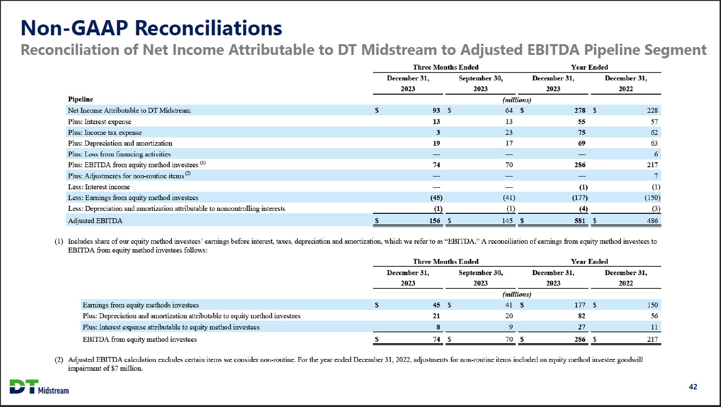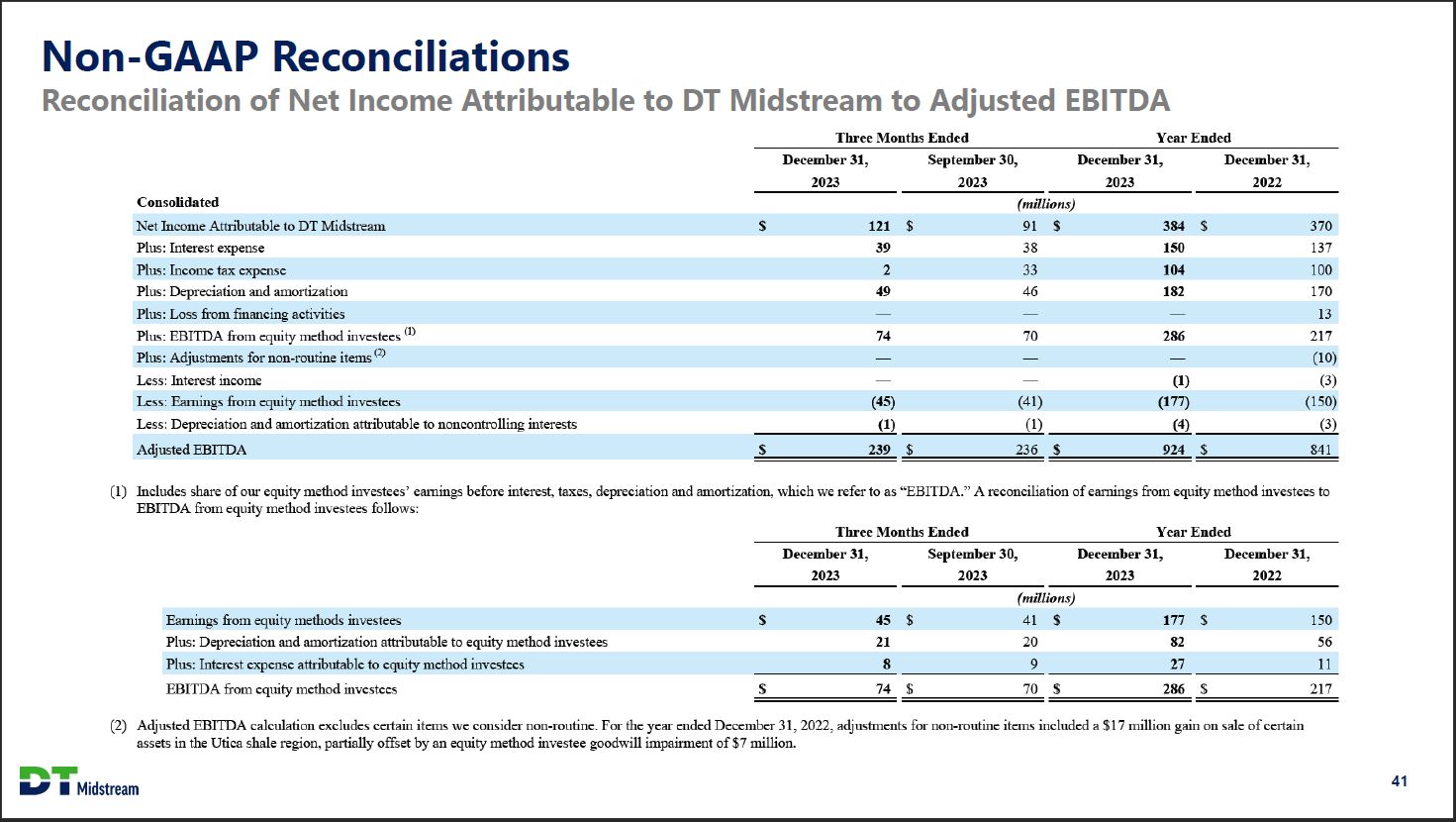 Non-GAAP Reconciliations Reconciliation of Net Income Attributable to DT Midstream to Adjusted EBITDA Three Months Ended Year Ended December 31, 2023 September 30, 2023 December 31, 2023 December 31, 2022 Consolidated (millions) Net Income Attributable to DT Midstream $ 121 $ 91 $ 384 $ 370 Plus: Interest expense $ 39 $ 38 $ 150 $ 137 Plus: Income tax expense 2 33 104 100 Plus: Depreciation and amortization 49 46 182 170 Plus: Loss from financing activities - - - 13 Plus: EBITDA from equity method investees (1) 74 70 286 217 Plus: Adjustments for non-routine items (2) - - - (10) Less: Interest income - - (1) (3) Less: Earnings from equity method investees (45) (41) (177) (150) Less: Depreciation and amortization attributable to noncontrolling interests (1) (1) (4) (3) Adjusted EBITDA $ 239 $ 236 $ 924 $ 841 (1) Includes share of our equity method investees' earnings before interest, taxes, depreciation and amortization, which we refer to as "EBITDA." A reconciliation of earnings from earnings from equity method investees to EBITDA from equity method investees follows: Three Months Ended Year Ended December 31, 2023 September 30, 2023 December 31, 2023 December 31, 2022 (millions) Earnings from equity methods investees $ 45 $ 41 $ 177 $ 150 Plus: Depreciation and amortization attributable to equity method investees 21 20 82 56 Plus: Interest expense attributable to equity method investees 8 9 27 11 EBITDA from equity method investees $ 74 $ 70 $ 286 $ 217 (2) Adjusted EBITDA calculation excludes certain items we consider non-routine. For the year ended December 31, 2022, adjustments for non-routine items included a $17 million gain on sale of certain assets in the Utica shale region, partially offset by an equity method investee goodwill impairment of $7 million. DT Midstream 41