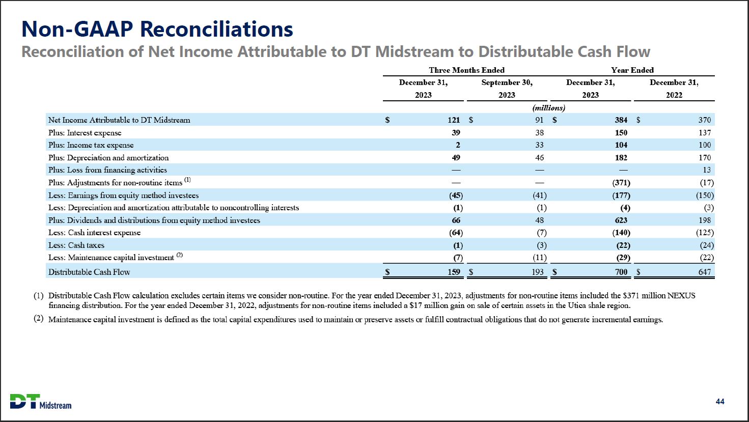 Non-GAAP Reconciliations Reconciliation of Net Income Attributable to DT Midstream to Distributable Cash Flow Three Months Ended Year Ended December 31, 2023 September 30, 2023 December 31, 2023 December 31, 2022 (millions) Net Income Attributable to DT Midstream $ 121 $ 91 $ 384 $ 370 Plus: Interest expense 39 38 150 137 Plus: Income tax expense 2 33 104 100 Plus: Depreciation and amortization 49 46 182 170 Plus: Loss from financing activities - - - 13 Plus: Adjustments for non-routine items (1) - - (371) (17) Less: Earnings from equity method investees (45) (41) (177) (150) Less: Depreciation and amortization attributable to noncontrolling interests (1) (1) (4) (3) Plus: Dividends and distributions from equity method investees 66 48 623 198 Less: Cash interest expense (64) (7) (140) (125) Less: Cash taxes (1) (3) (22) (24) Less: Maintenance capital investment(2) (7) (11) (29) (22) Distributable Cash Flow $ 159 $ 193 $ 700 $ 647 (1) Distributable Cash Flow calculation excludes certain items we consider non-routine. For the year ended December 31, 2023, adjustments for non-routine items included the $371 million NEXUS financing distribution. For the year ended December 31, 2022, adjustments for non-routine items included a $17 million gain on sale of certain assets in the Utica shale region (2) Maintenance capital investment is defined as the total capital expenditures used to maintain or preserve assets or fulfill contractual obligations that do not generate incremental earnings. 44