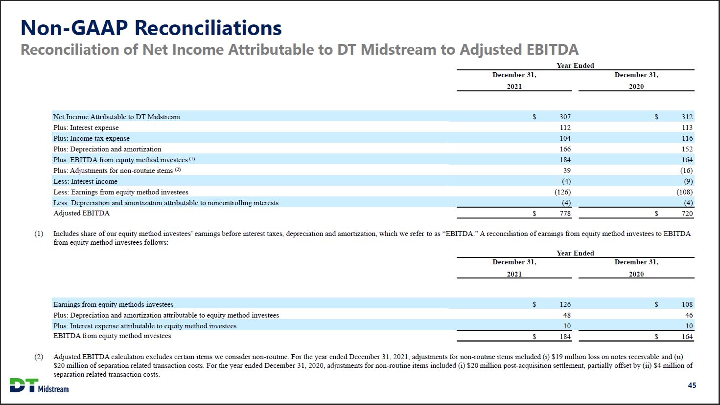 Non-GAAP Reconciliations Reconciliation of Net Income Attributable to DT Midstream to Adjusted EBITDA Year Ended December 31, 2021 December 31, 2020 Net Income Attributable to DT Midstream $ 307 $ 312 Plus: Interest expense 112 113 Plus: Income tax expense 104 116 Plus: Depreciation and amortization 166 152 Plus: EBITDA from equity method investees (1) 184 164 Plus: Adjustments for non-routine items (2) 39 (16) Less: Interest income (4) (9) Less: Earnings from equity method investees (126) (108) Less: Depreciation and amortization attributable to noncontrolling interests (4) (4) Adjusted EBITDA $ 778 $ 720 Includes share of our equity method investees' earnings before interest taxes, depreciation and amortization, which we refer to as "EBITDA." A reconciliation of earnings from equity method investees to EBITDA from equity method investees follows: Year Ended December 31, 2021 December 31, 2020 Earnings from equity methods investees $ 126 $ 108 Plus: Depreciation and amortization attributable to equity method investees 48 46 Plus: Interest expense attributable to equity method investees 10 10 EBITDA from equity method investees $ 184 $ 164 (2) Adjusted EBITDA calculation excludes certain items we consider non-routine. For the year ended December 31, 2021, adjustments for non-routine items included (i) $19 million loss on notes receivable and (ii) $20 million of separation related transaction costs. For the year ended December 31, 2020, adjustments for non-routine items included (i) $20 million post-acquisition settlement, partially offset by (ii) $4 million of separation related transaction costs. DT Midstream 45