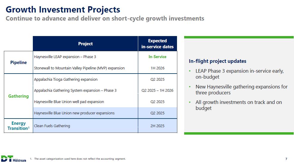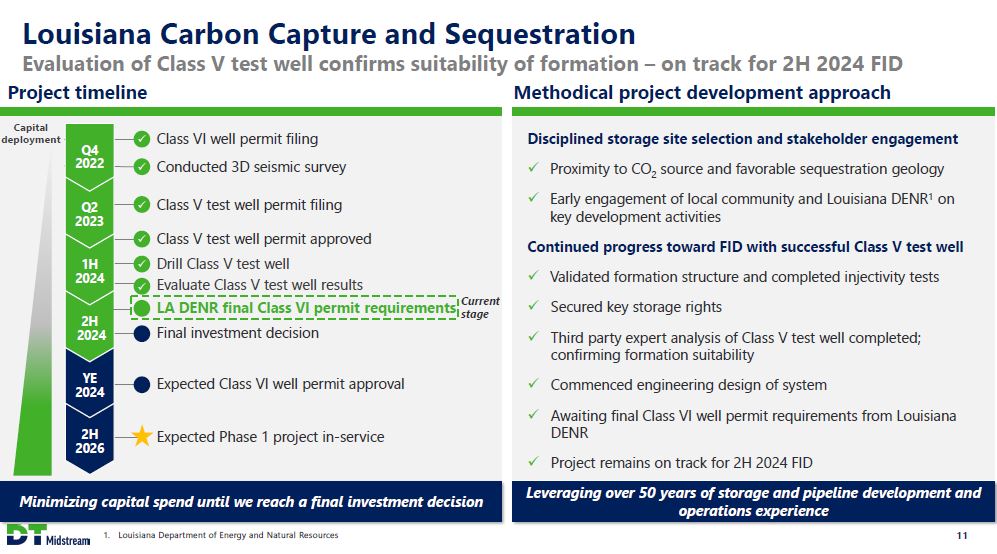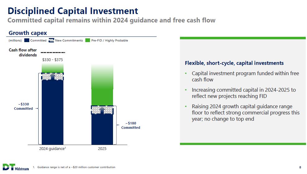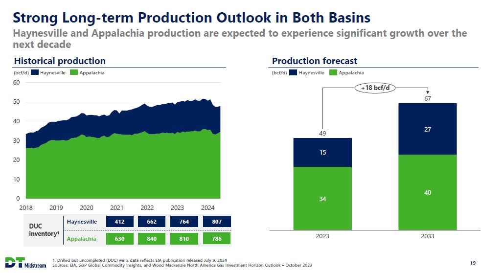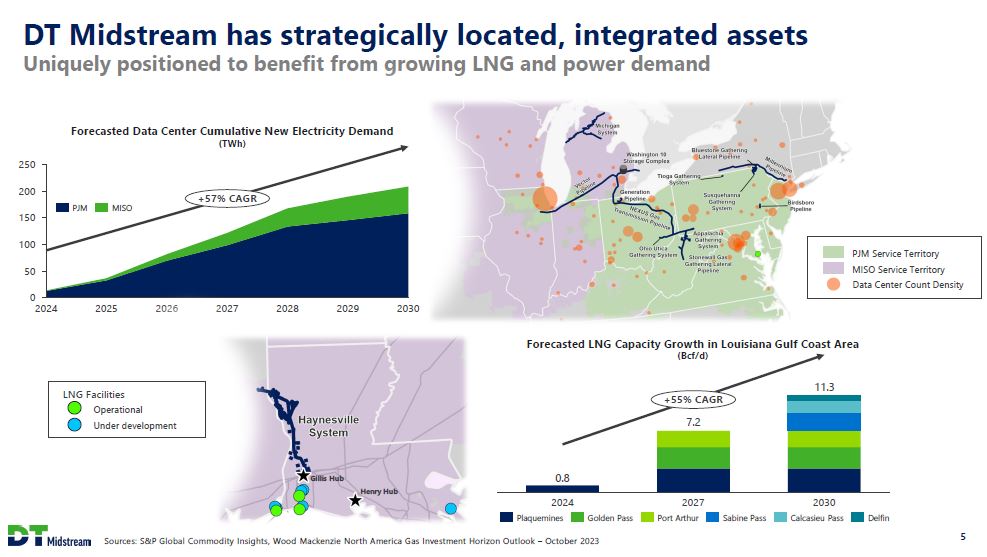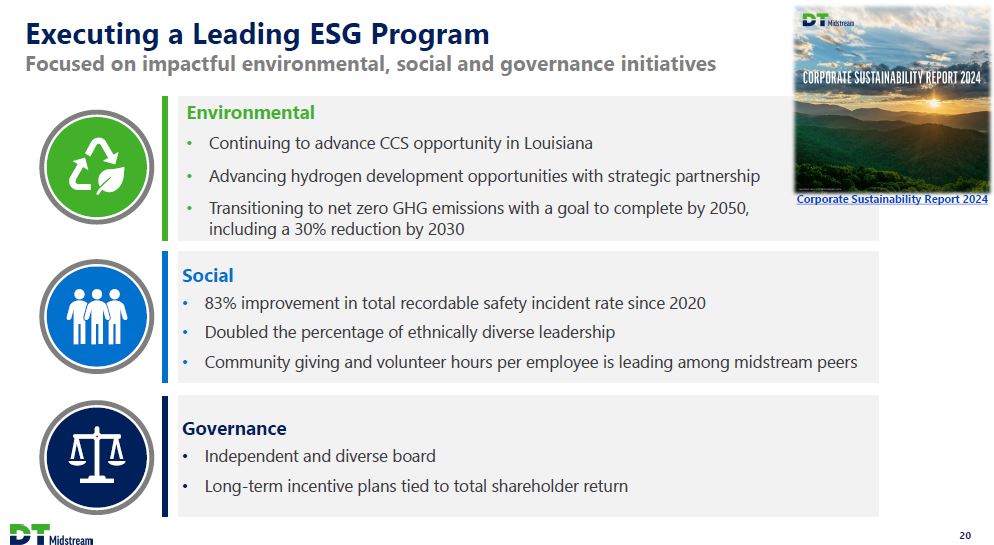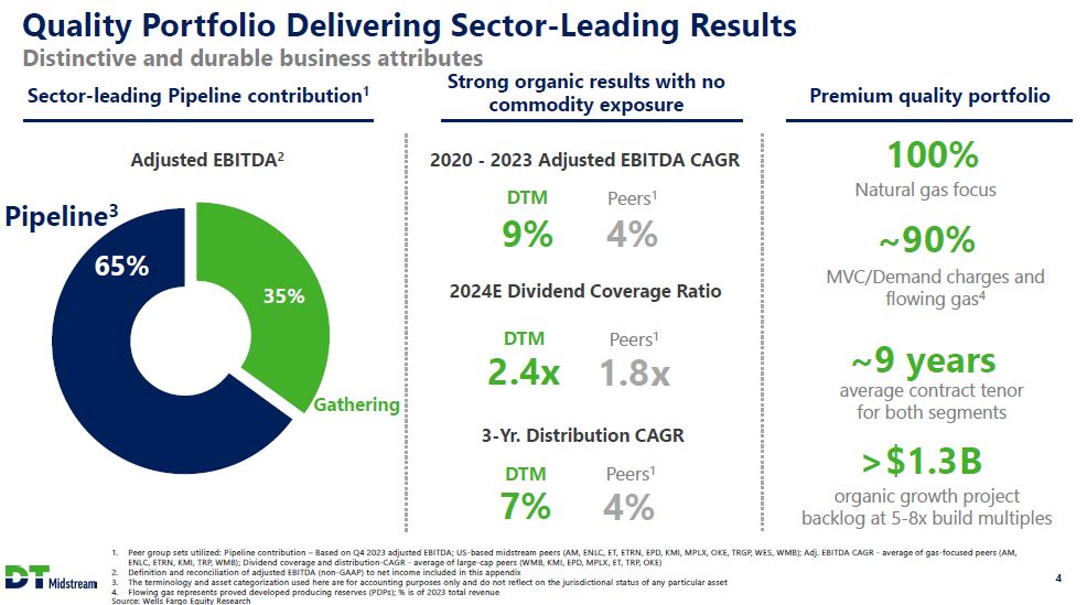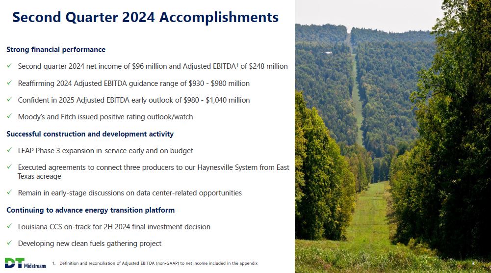 Safe Harbor Statement This presentation contains statements which, to the extent they are not statements of historical or present fact, constitute "forward-looking statements" under the securities laws. These forward-looking statements are intended to provide management's current expectations or plans for our future operating and financial performance, business prospects, outcomes of regulatory proceedings, market conditions, and other matters, based on what we believe to be reasonable assumptions and on information currently available to us. Forward-looking statements can be identified by the use of words such as "believe," "expect," "expectations," "plans," "strategy," "prospects," "estimate," "project," "target," "anticipate," "will," "should," "see," "guidance," "outlook," "confident" and other words of similar meaning. The absence of such words, expressions or statements, however, does not mean that the statements are not forward-looking. In particular, express or implied statements relating to future earnings, cash flow, results of operations, uses of cash, tax rates and other measures of financial performance, future actions, conditions or events, potential future plans, strategies or transactions of DT Midstream, and other statements that are not historical facts, are forward-looking statements. Forward-looking statements are not guarantees of future results and conditions, but rather are subject to numerous assumptions, risks, and uncertainties that may cause actual future results to be materially different from those contemplated, projected, estimated, or budgeted. Many factors may impact forward-looking statements of DT Midstream including, but not limited to, the following: changes in general economic conditions, including increases in interest rates and associated Federal Reserve policies, a potential economic recession, and the impact of inflation on our business; industry changes, including the impact of consolidations, alternative energy sources, technological advances, infrastructure constraints and changes in competition; global supply chain disruptions; actions taken by third-party operators, processors, transporters and gatherers; changes in expected production from Southwestern Energy and other third parties in our areas of operation; demand for natural gas gathering, transmission, storage, transportation and water services; the availability and price of natural gas to the consumer compared to the price of alternative and competing fuels; our ability to successfully and timely implement our business plan; our ability to complete organic growth projects on time and on budget; our ability to finance, complete, or successfully integrate acquisitions; the price and availability of debt and equity financing; restrictions in our existing and any future credit facilities and indentures; the effectiveness of our information technology and operational technology systems and practices to detect and defend against evolving cyber attacks on United States critical infrastructure; changing laws regarding cybersecurity and data privacy, and any cybersecurity threat or event; operating hazards, environmental risks, and other risks incidental to gathering, storing and transporting natural gas; geologic and reservoir risks and considerations; natural disasters, adverse weather conditions, casualty losses and other matters beyond our control; the impact of outbreaks of illnesses, epidemics and pandemics, and any related economic effects; the impacts of geopolitical events, including the conflicts in Ukraine and the Middle East; labor relations and markets, including the ability to attract, hire and retain key employee and contract personnel; large customer defaults; changes in tax status, as well as changes in tax rates and regulations; the effects and associated cost of compliance with existing and future laws and governmental regulations, such as the Inflation Reduction Act; changes in environmental laws, regulations or enforcement policies, including laws and regulations relating to climate change and greenhouse gas emissions; ability to develop low carbon business opportunities and deploy greenhouse gas reducing technologies; changes in insurance markets impacting costs and the level and types of coverage available; the timing and extent of changes in commodity prices; the success of our risk management strategies; the suspension, reduction or termination of our customers' obligations under our commercial agreements; disruptions due to equipment interruption or failure at our facilities, or third-party facilities on which our business is dependent; the effects of future litigation; and the risks described in our Annual Report on Form 10-K for the year ended December 31, 2023 and our reports and registration statements filed from time to time with the SEC. The above list of factors is not exhaustive. New factors emerge from time to time. We cannot predict what factors may arise or how such factors may cause actual results to vary materially from those stated in forward-looking statements, see the discussion under the section entitled "Risk Factors" in our Annual Report for the year ended December 31, 2023, filed with the SEC on Form 10-K and any other reports filed with the SEC. Given the uncertainties and risk factors that could cause our actual results to differ materially from those contained in any forward-looking statement, you should not put undue reliance on any forward-looking statements. Any forward-looking statements speak only as of the date on which such statements are made. We are under no obligation to, and expressly disclaim any obligation to, update or alter our forward-looking statements, whether as a result of new information, subsequent events or otherwise. DT Midstream