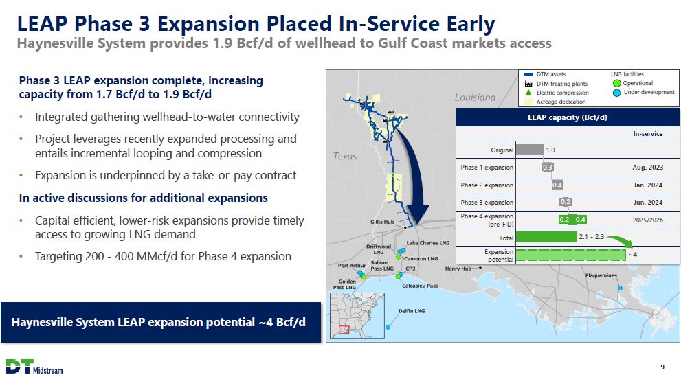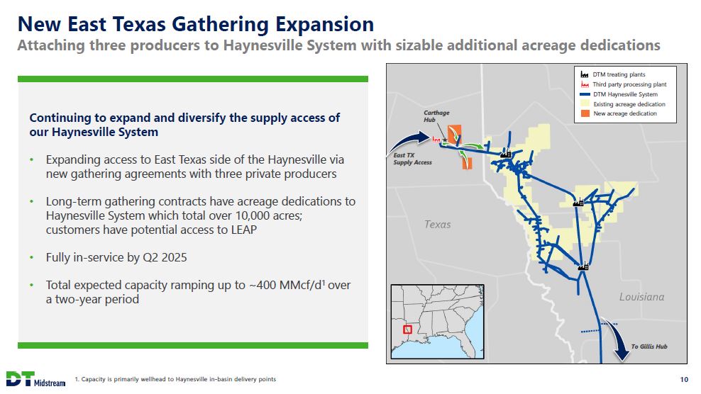 New East Texas Gathering Expansion Attaching three producers to Haynesville System with sizable additional acreage dedications Continuing to expand and diversify the supply access of our Haynesville System Expanding access to East Texas side of the Haynesville via new gathering agreements with three private producers Long-term gathering contracts have acreage dedications to Haynesville System which total over 10,000 acres; customers have potential access to LEAP Fully in-service by Q2 2025 Total expected capacity ramping up to ~400 MMcf/d1 over a two-year period DTM treating plants Third party processing plant DTM Haynesville System Existing acreage dedication New acreage dedication Carthage Hub East TX Supply Access Texas Louisiana To Gillis Hub DT Midstream 1. Capacity is primarily wellhead to Haynesville in-basin delivery points 10