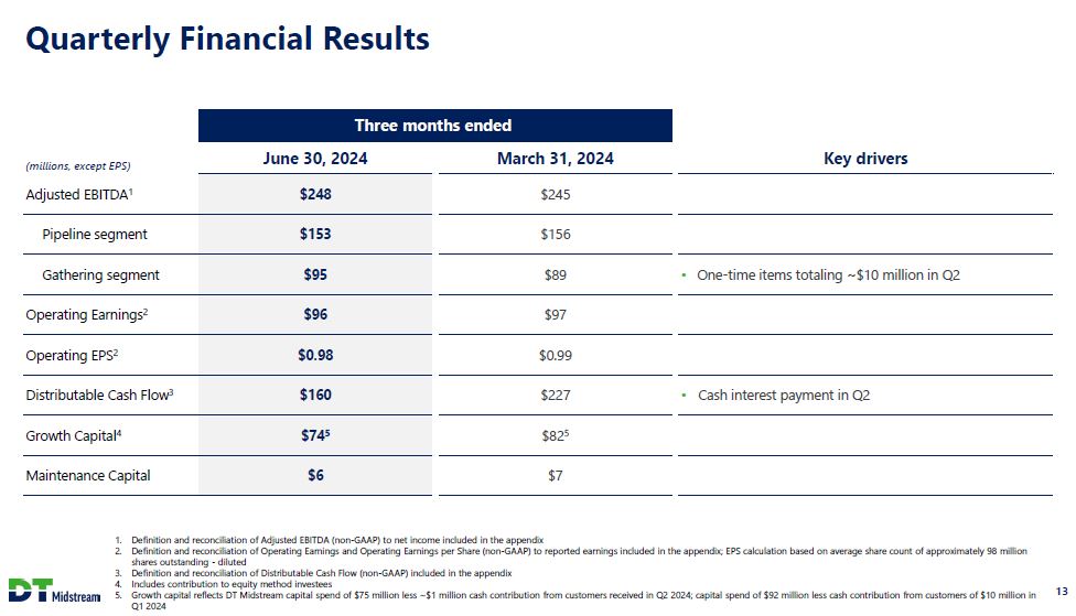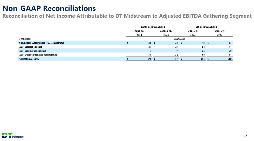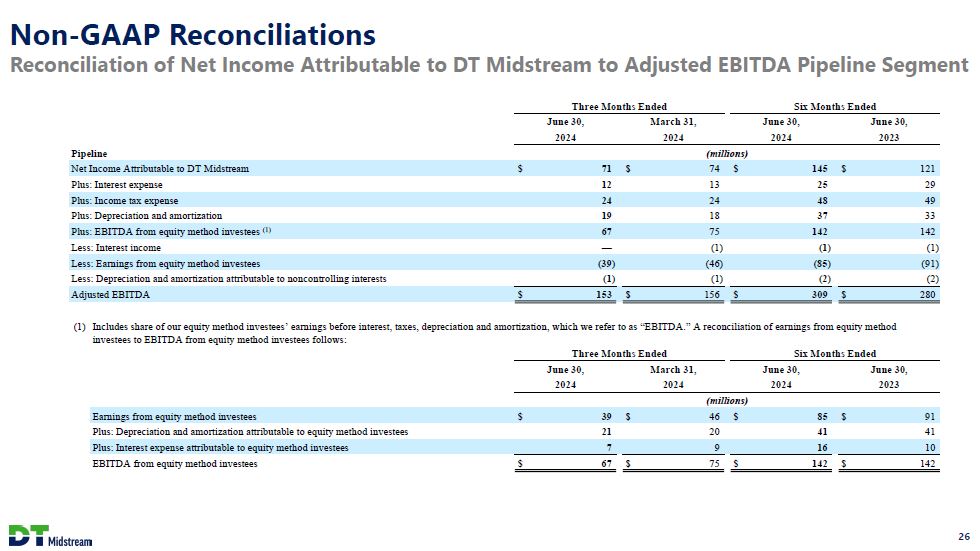 Non-GAAP Reconciliations Reconciliation of Net Income Attributable to DT Midstream to Adjusted EBITDA Pipeline Segment Three Months Ended Six Months Ended June 30, 2024 March 31, 2024 June 30, 2024 June 30, 2023 Pipeline (millions) Net Income Attributable to DT Midstream $71 $74 $145 $121 Plus: Interest expense 12 13 25 29 Plus: Income tax expense 24 24 48 49 Plus: Depreciation and amortization 19 18 37 33 Plus: EBITDA from equity method investees(1) 67 75 142 142 Less: Interest income - (1) (1) (1) Less: Earnings from equity method investees (39) (46) (85) (91) Less: Depreciation and amortization attributable to noncontrolling interests (1) (1) (2) (2) Adjusted EBITDA $153 $156 $309 $280 (1) Includes share of our equity method investees' earnings before interest, taxes, depreciation and amortization, which we refer to as "EBITDA." A reconciliation of earnings from equity method investees to EBITDA from equity method investees follows: Three Months Ended Six Months Ended June 30, 2024 March 31, 2024 June 30, 2024 June 30, 2023 (millions) Earnings from equity method investees $39 $46 $85 $91 Plus: Depreciation and amortization attributable to equity method investees 21 20 41 41 Plus: Interest expense attributable to equity method investees 7 9 16 10 EBITDA from equity method investees $67 $75 $142 $142 DT Midstream 26