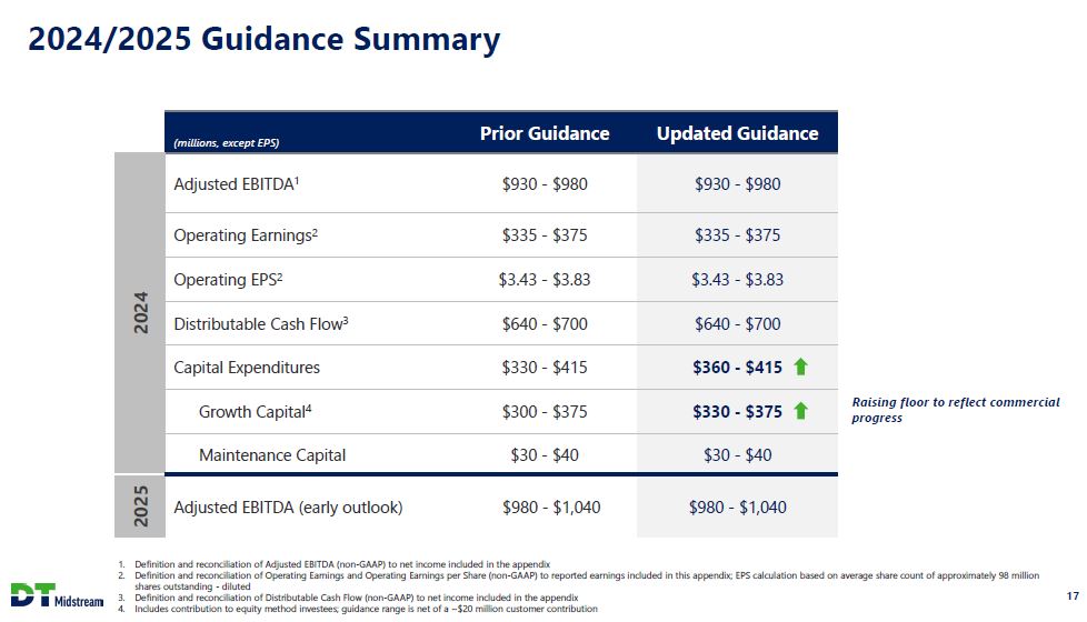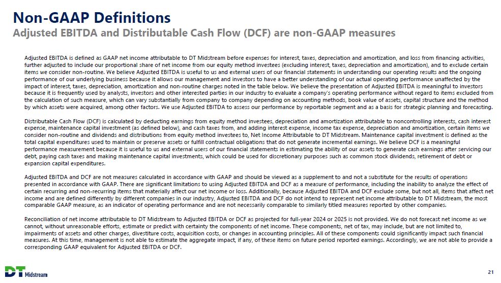 Non-GAAP Definitions Adjusted EBITDA and Distributable Cash Flow (DCF) are non-GAAP measures Adjusted EBITDA is defined as GAAP net income attributable to DT Midstream before expenses for interest, taxes, depreciation and amortization, and loss from financing activities, further adjusted to include our proportional share of net income from our equity method investees (excluding interest, taxes, depreciation and amortization), and to exclude certain items we consider non-routine. We believe Adjusted EBITDA is useful to us and external users of our financial statements in understanding our operating results and the ongoing performance of our underlying business because it allows our management and investors to have a better understanding of our actual operating performance unaffected by the impact of interest, taxes, depreciation, amortization and non-routine charges noted in the table below. We believe the presentation of Adjusted EBITDA is meaningful to investors because it is frequently used by analysts, investors and other interested parties in our industry to evaluate a company's operating performance without regard to items excluded from the calculation of such measure, which can vary substantially from company to company depending on accounting methods, book value of assets, capital structure and the method by which assets were acquired, among other factors. We use Adjusted EBITDA to assess our performance by reportable segment and as a basis for strategic planning and forecasting. Distributable Cash Flow (DCF) is calculated by deducting earnings from equity method investees, depreciation and amortization attributable to noncontrolling interests, cash interest expense, maintenance capital investment (as defined below), and cash taxes from, and adding interest expense, income tax expense, depreciation and amortization, certain items we consider non-routine and dividends and distributions from equity method investees to, Net Income Attributable to DT Midstream. Maintenance capital investment is defined as the total capital expenditures used to maintain or preserve assets or fulfill contractual obligations that do not generate incremental earnings. We believe DCF is a meaningful performance measurement because it is useful to us and external users of our financial statements in estimating the ability of our assets to generate cash earnings after servicing our debt, paying cash taxes and making maintenance capital investments, which could be used for discretionary purposes such as common stock dividends, retirement of debt or expansion capital expenditures. Adjusted EBITDA and DCF are not measures calculated in accordance with GAAP and should be viewed as a supplement to and not a substitute for the results of operations presented in accordance with GAAP. There are significant limitations to using Adjusted EBITDA and DCF as a measure of performance, including the inability to analyze the effect of certain recurring and non-recurring items that materially affect our net income or loss. Additionally, because Adjusted EBITDA and DCF exclude some, but not all, items that affect net income and are defined differently by different companies in our industry, Adjusted EBITDA and DCF do not intend to represent net income attributable to DT Midstream, the most comparable GAAP measure, as an indicator of operating performance and are not necessarily comparable to similarly titled measures reported by other companies. Reconciliation of net income attributable to DT Midstream to Adjusted EBITDA or DCF as projected for full-year 2024 or 2025 is not provided. We do not forecast net income as we cannot, without unreasonable efforts, estimate or predict with certainty the components of net income. These components, net of tax, may include, but are not limited to, impairments of assets and other charges, divestiture costs, acquisition costs, or changes in accounting principles. All of these components could significantly impact such financial measures. At this time, management is not able to estimate the aggregate impact, if any, of these items on future period reported earnings. Accordingly, we are not able to provide a corresponding GAAP equivalent for Adjusted EBITDA or DCF. DTMidstream 21