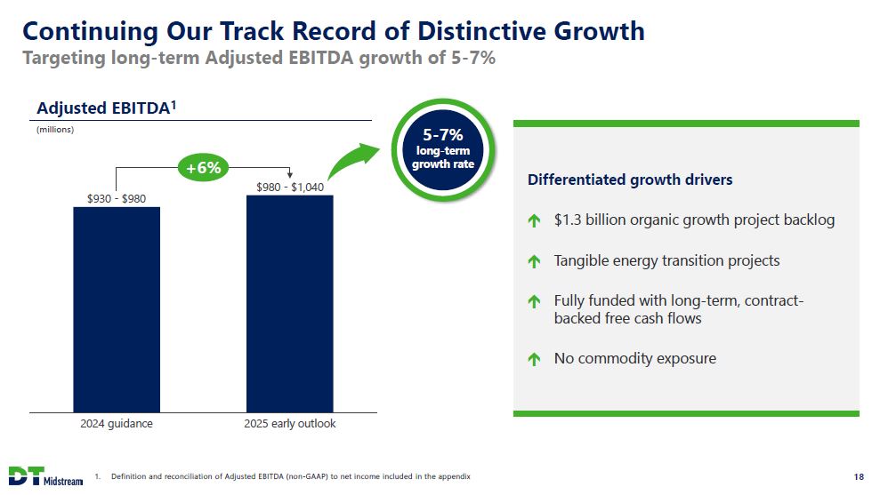 2024/2025 Guidance Summary (millions, except EPS) Prior Guidance Updated Guidance 2024 Adjusted EBITDA1 $930 - $980 $930 - $980 Operating Earnings2 $335 - $375 $335 - $375 Operating EPS2 $3.43 - $3.83 $3.43 - $3.83 Distributable Cash Flow3 $640 - $700 $640 - $700 Capital Expenditures $330 - $415 $360 - $415 Growth Capital4 $300 - $375 $330 - $375 Raising floor to reflect progress Maintenance Capital $30 - $40 $30 - $40 2025 Adjusted EBITDA (early outlook) $980 - $1,040 $980 - $1,040 1. Definition and reconciliation of Adjusted EBITDA (non-GAAP) to net income included in the appendix 2. Definition and reconciliation of Operating Earnings and Operating Earnings per Share (non-GAAP) to reported earnings included in this appendix; EPS calculation based on average share count of approximately 98 million shares outstanding - diluted 3. Definition and reconciliation of Distributable Cash Flow (non-GAAP) to net income included in the appendix 4. Includes contribution to equity method investees; guidance range is net of a ~$20 million customer contribution DT Midstream 17