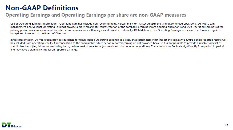 Non-GAAP Definitions Operating Earnings and Operating Earnings per share are non-GAAP measures Use of Operating Earnings Information - Operating Earnings exclude non-recurring items, certain mark-to-market adjustments and discontinued operations. DT Midstream management believes that Operating Earnings provide a more meaningful representation of the company's earnings from ongoing operations and uses Operating Earnings as the primary performance measurement for external communications with analysts and investors. Internally, DT Midstream uses Operating Earnings to measure performance against budget and to report to the Board of Directors. In this presentation, DT Midstream provides guidance for future period Operating Earnings. It is likely that certain items that impact the company's future period reported results will be excluded from operating results. A reconciliation to the comparable future period reported earnings is not provided because it is not possible to provide a reliable forecast of specific line items (i.e., future non-recurring items, certain mark-to-market adjustments and discontinued operations). These items may fluctuate significantly from period to period and may have a significant impact on reported earnings. DT Midstream 22